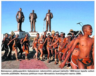 Jutussa mainittiin Afrikka merkittävänä markkinana näille ja kuvituksena oli myös Gaboronessa oleva kolmen Botswanan historiaan merkittävästi vaikuttaneen miehen isokokoiset patsaat.