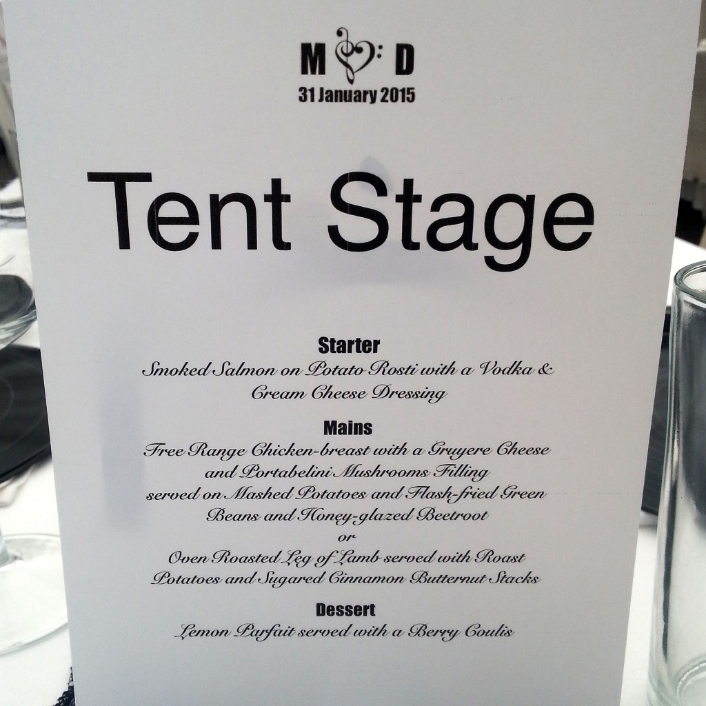 Ruokailu järjestettiin katetussa tilassa pöytiin tarjoiltuna. Pöytäkoristelussa oli otettu myös mukaan musiikkiteemaa pienillä erilaisilla yksityiskohdilla. Ruokailussa oli myös otettu mukaan molemmat maat, sillä ruokailun alkuun vieraille tarjottiin shotit: suomalaiset saivat amarulaa ja etelä-afrikkalaiset saivat maistaa salmiakkikossua. Pienen gallupin jälkeen sain tulokseksi 50/50 salmiakkikossusta, maku ei ollut kaikkien mieleen, mutta fanejakin löytyi.