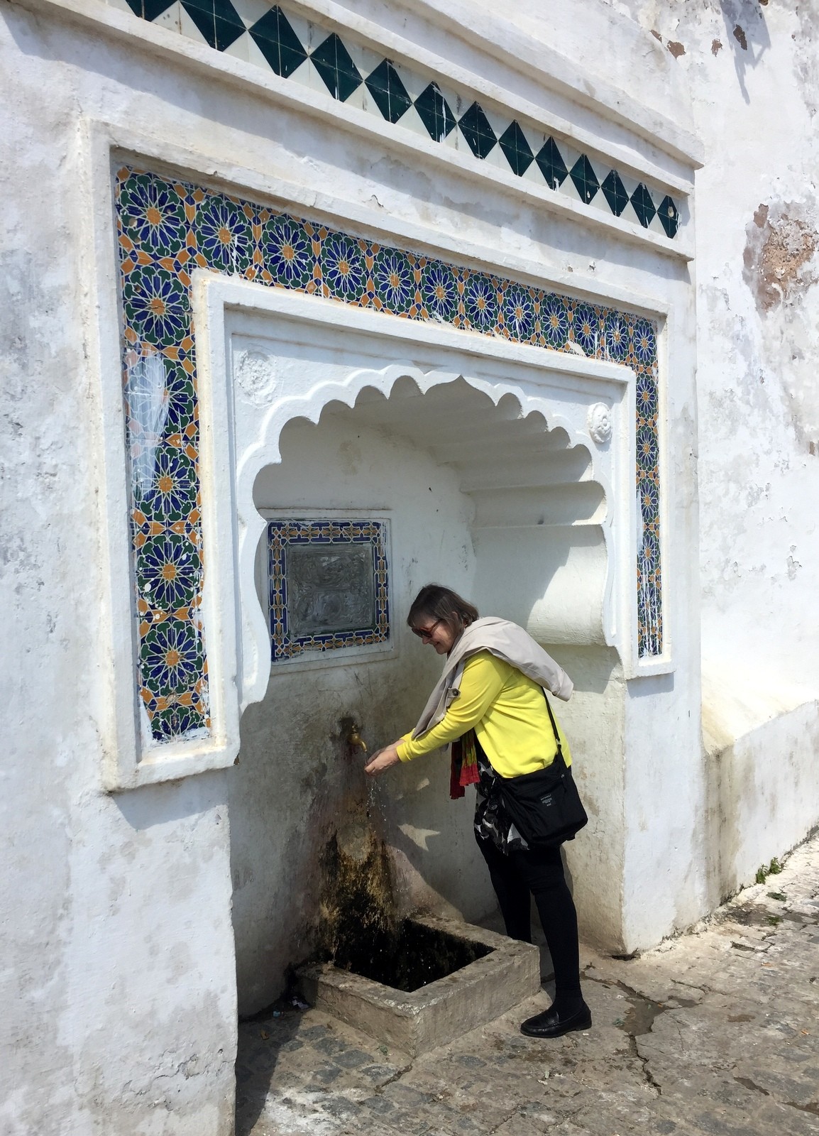 Ennen ateriaa pesemme kädet yhdellä casbahin alueen lukuisista kauniista vesipisteistä – paikalliset syövät ruokansa pitkälti sormin, joten käsien peseminen ennen ruokailua on erityisen tärkeää.