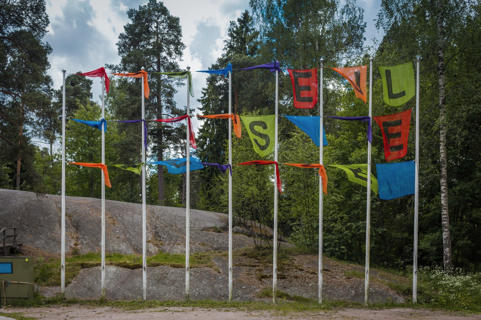 Juhlakentän laidasta löytyy vielä yksi Finnish Landscape -näyttelyn teos, eli Ahmed Al-Nawaksen ja Manna Henrikssonin lippurivistö Valkeat, joka muistelee kesällä 1962 Helsingissä järjstettyä Maailman nuorisofestivaalia. Teoksen toteutus kyllä ainakin tuulisella säällä jättää hiukan toivomisen varaa, sillä kirjainrivistö, jossa lukee UN SEUL HEROS LE PEUPLE, ei lippujen kietouduttua naruihinsa ollut sunnuntaina luettavissa. Onneksi taiteilija oli sen torstaina Lasselle esitellyt :-)