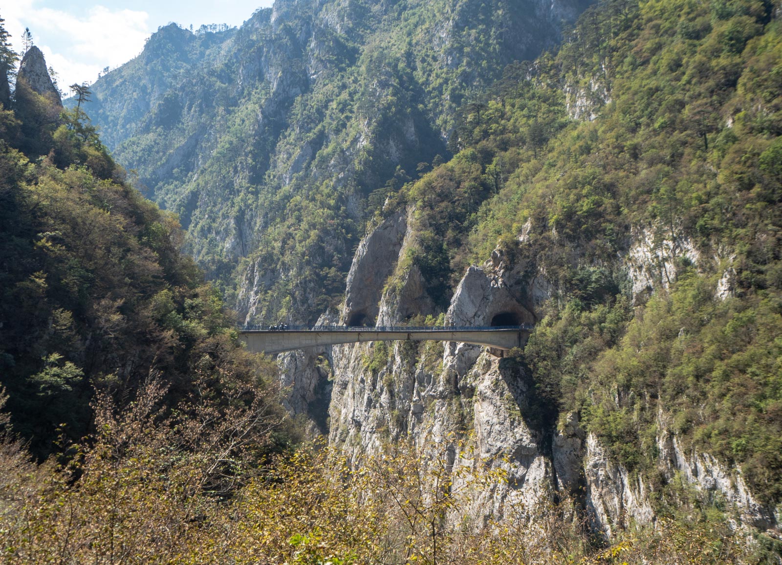 Brod na Drinin sillan jälkeen tie muuttui todella kapeaksi, asvalttia oli enää tarjolla yhden kaistan verran, mutta pientareet olivat sen verran leveitä, että kaksisuuntainenkin liikenne sujui, kunhan oli tarkkana. Moottoripyöriä oli liikkeellä paljon – ehkä tämä tie Sarajevon ja Podgorican välillä kaikkine nousuineen ja laskuineen ja mutkineen on erityisesti heidän suosiossaan!