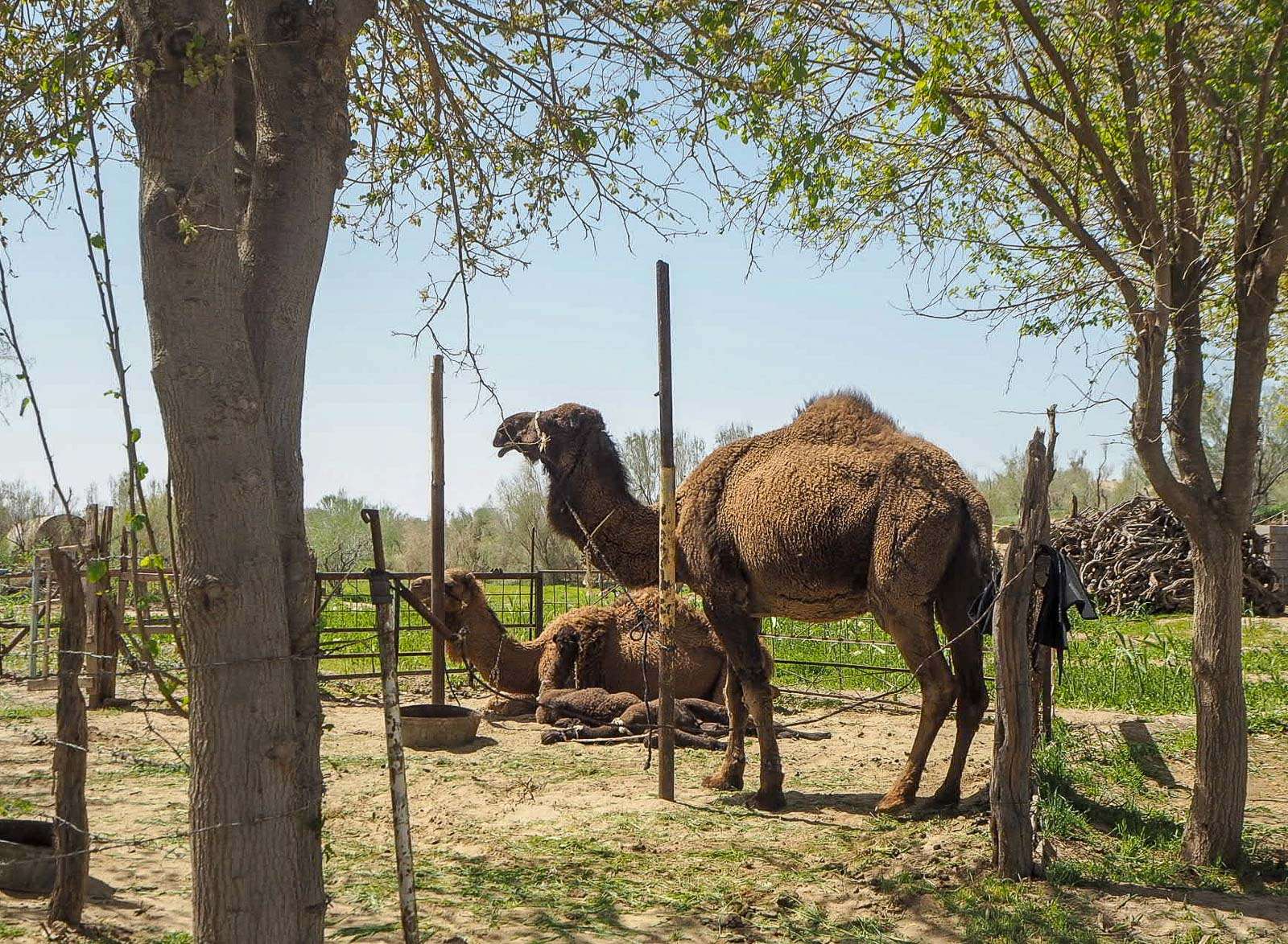 Kiersimme myös eläinsuojia: vuohia, kanoja ja – turistille tietysti mielenkiintoisimmat – kamelit. Perheen tytär jopa lypsi toisen kamelin meidän seuratessa toimitusta. Lypsäminen aloitettiin antamalla toisen poikasista ensin imeä vähän aikaa, jonka jälkeen se häädettiin pois ja tytär jatkoi maidon lypsämistä astiaan. Vaihdosta ei ollut mielissään ei emo eikä poikanen, joten lypsäjä sai olla varuillaan!