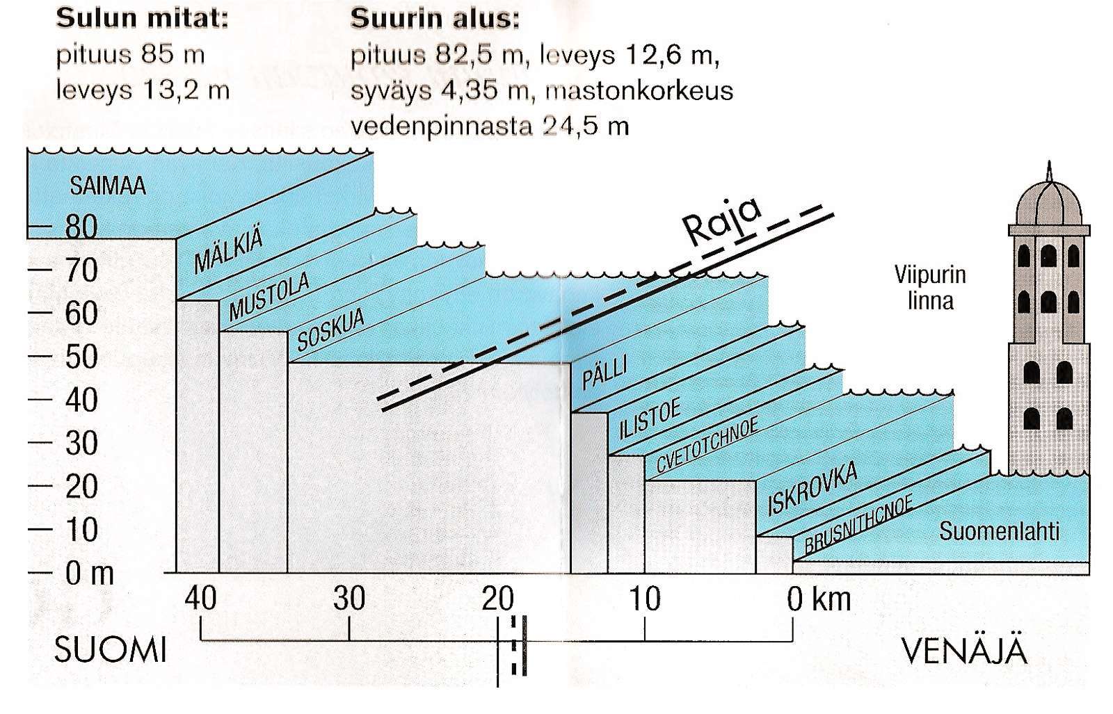 Kanavan pituus on 43 kilometriä, mutta matkailijan kannalta mielenkiintoisempaa Saimaan ja Suomenlahden välinen korkeusero, joka on keskimäärin 76 metriä. Sulkuja on kahdeksan, kolme Suomen puolella ja viisi Venäjän puolella. Sulkujen korkeus vaihtelee 5,5 metristä 12,4 metriin: matalin sulku on Cvetotchnoe, keskimmäinen Venäjän puolen suluista ja korkein Mälkiä, ensimmäinen Suomen puolen suluista Lappeenrannasta lähdettäessä. Sulkujen pituus on 85 metriä ja leveys 13,2 metriä. Ilmeisesti sulkujen pituus alkaa jo olla rajoittava tekijä Saimaan kanavan rahtiliikenteelle ja päätöstä sulkujen pidentämisestä odotellaankin toiveikkaasti. Ehkä Saimaan kanavasta tulee vielä yksi Antti Rinteenkin hallituksen infrastruktuurihankkeista?