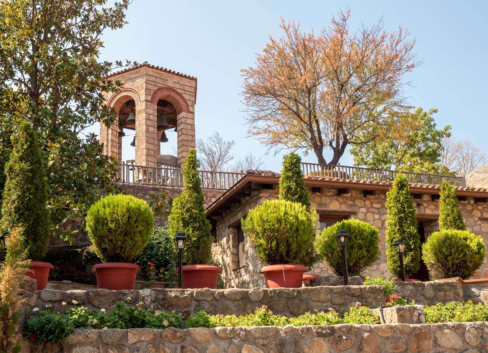 Agios Stephanos -kalliolla sijaitseva luostari perustettiin 1100-luvun alussa. Pieni kappeli rakennettiin 1500-luvulla ja Saint Charalambokselle omistettu pääkatedraali 1700-luvulla. Vanhan kappelin seinissä voi erottaa luodin jälkiä, sillä toinen maailmansota ja Kreikan sodat jättivät jälkensä tännekin.