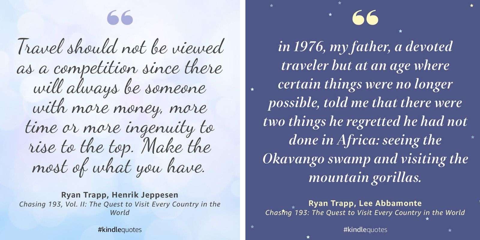 Chasing 193 -kirjat ovat kokoelma paljon matkustavien kertomuksia itsestään matkailijoina. Ensimmäisen kirjan ovat koonneet Ryan Trapp ja Lee Abbamonte, toisen Ryan Trapp ja Henrik Jeppesen.