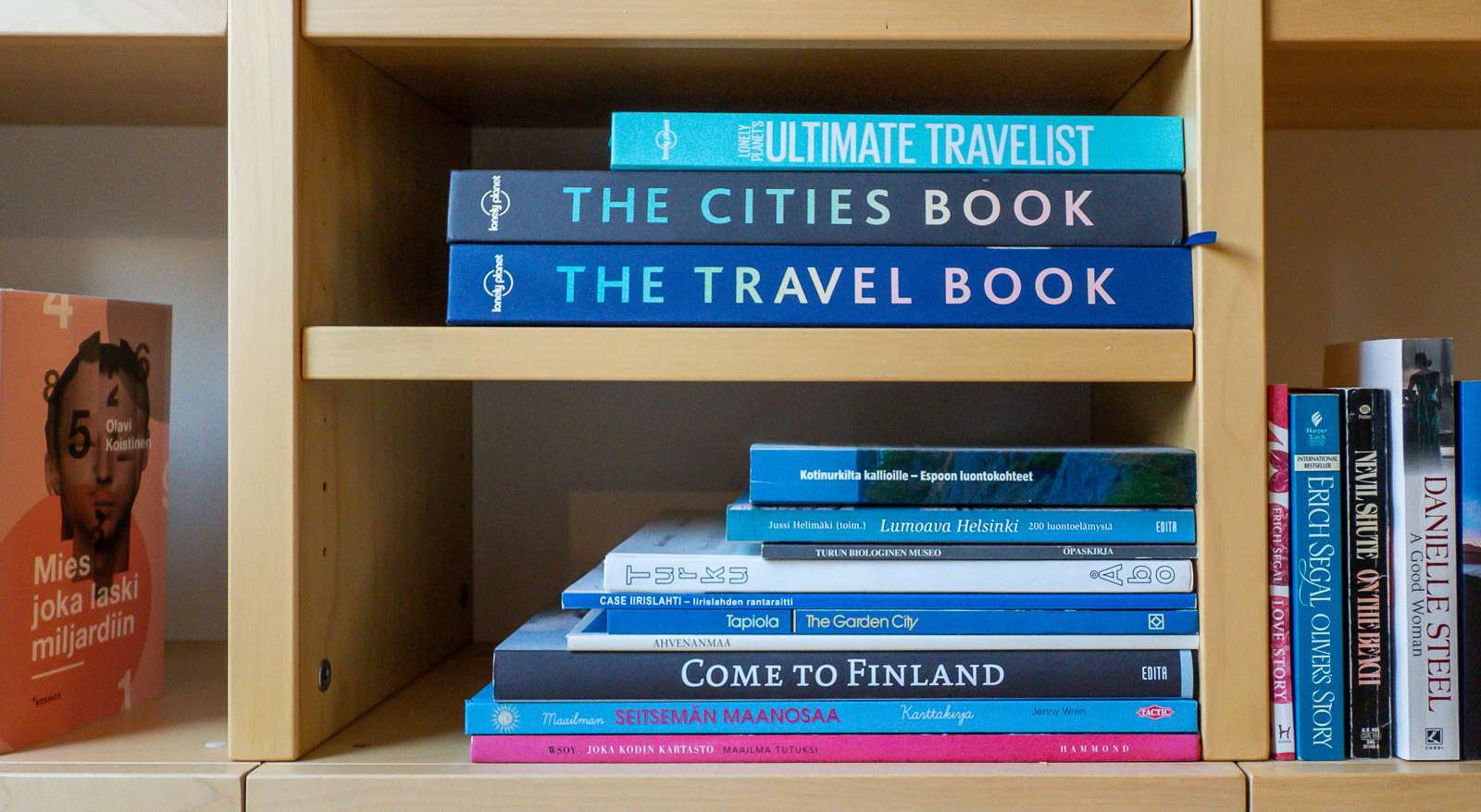 Nämä siis fiktion osalta. Muina lajityyppeinä kirjahyllyistämme löytyy tietysti kokoelma matkakohteita esitteleviä kirjoja, matkakirjoja ja matkailullisia elämänkertoja. Hienoinen kiinnostus muotiin, minimalismiin ja kirjoittamiseenkin näkyvät nekin pieninä kirjakokoelmina, Niin minimalisti en ole, että kokonaan hävittäisin kirjat, vaikka pääosan kirjoista hankinkin nykyisin e-kirjoina. Äänikirjoista en ole innostunut – haluan pysytä selaamaan kirjaa eteen- tai taaksepäin ja palaamaan myöhemmin ehkä johonkin kohtaan.