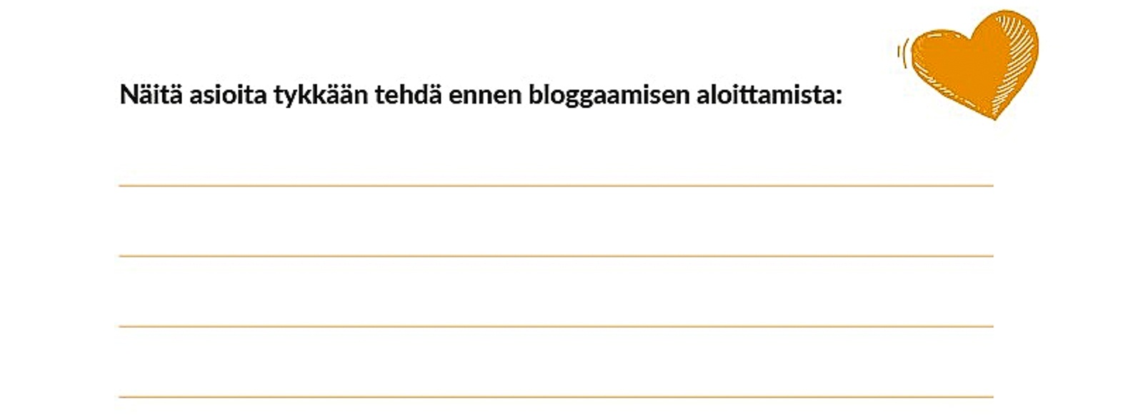 Yleisemmin sisältösuunnitelmaa ohjaa tietysti blogille asetetut tavoitteet, jotka sisältösuunnitelman myötä konkretisoituvat teemoiksi ja lopulta yksittäisiksi juttuaiheiksi. Sisältösuunnitelman voi dokumentoida aluksi vaikka ihan työkirjan pirteän oransseille sivuille!
