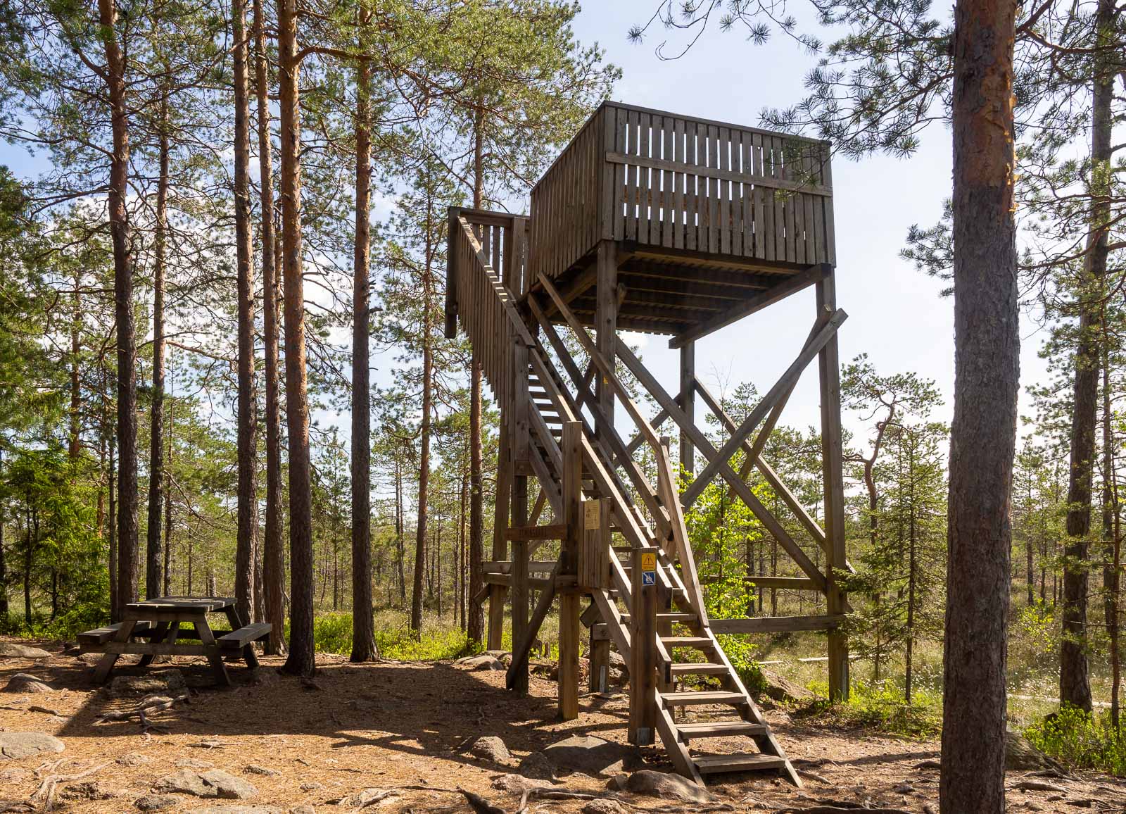 Kierroksemme, myötäpäivään, jatkuu lähes puuttomalla suolla. Matkan puolivälissä on tarjolla näköalapaikka, lintutorni, jonne tietysti kiipeämme. Luontopolulla olemme kohdanneet muutaman muun kulkijan, mutta lintutornissa saamme olla kahdestaan. Vieraskirjan mukaan joku on jo tänään, meitä aikaisemmin, nähnyt täällä mm. kurkia. Meillä ei ole kiikareita matkassa, mutta kuulemme käen kukkuvan.