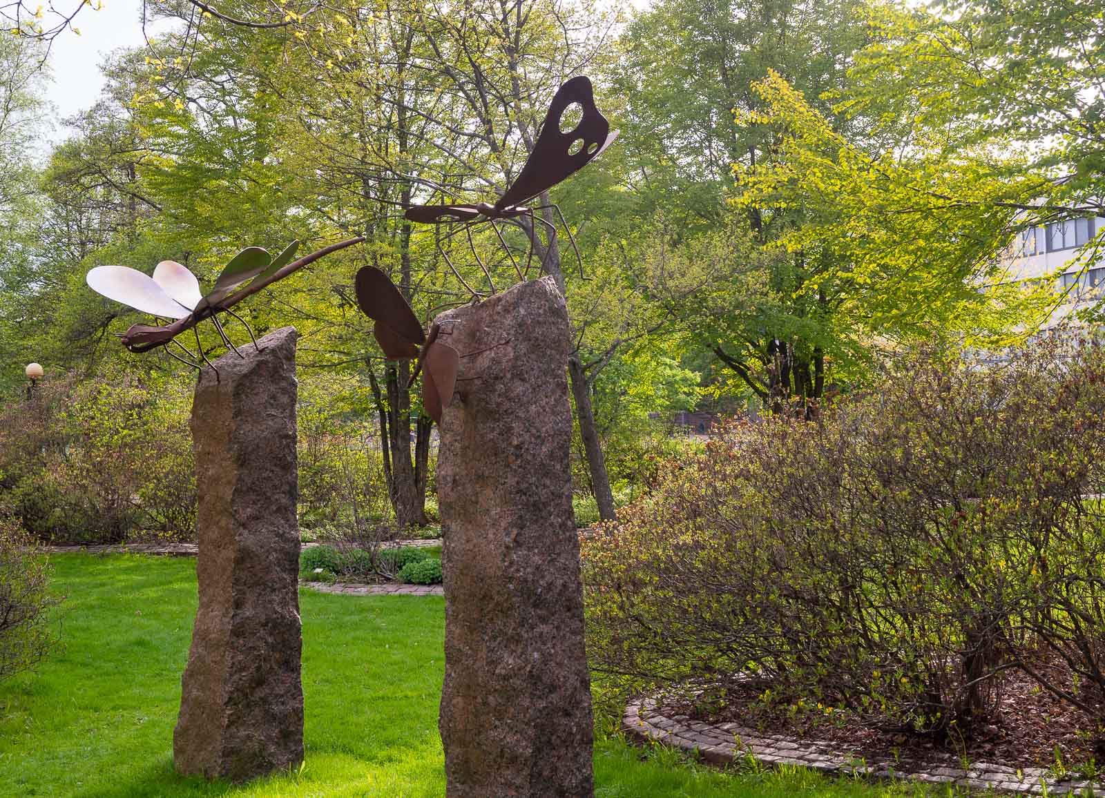 Puiston ylätasanteella on jonkinlainen allas ja sen keskellä teräsveistos (katso tämän jutun otsikkokuva). Altaasta vesi virtaa alempana oleviin altaiseen ja niistä edelleen jokeen. Isommassa lammessa on kuulemma upeat lummeistutukset, mutta toukokuussa niistä ei vielä näy jälkeäkään. Graniittimuurien lisäksi puistossa on siellä täällä kivoja pieniä graniittieläimiä ja rannalla vähän tylsempi Tukinuttaja -patsas (Emil Wikström).