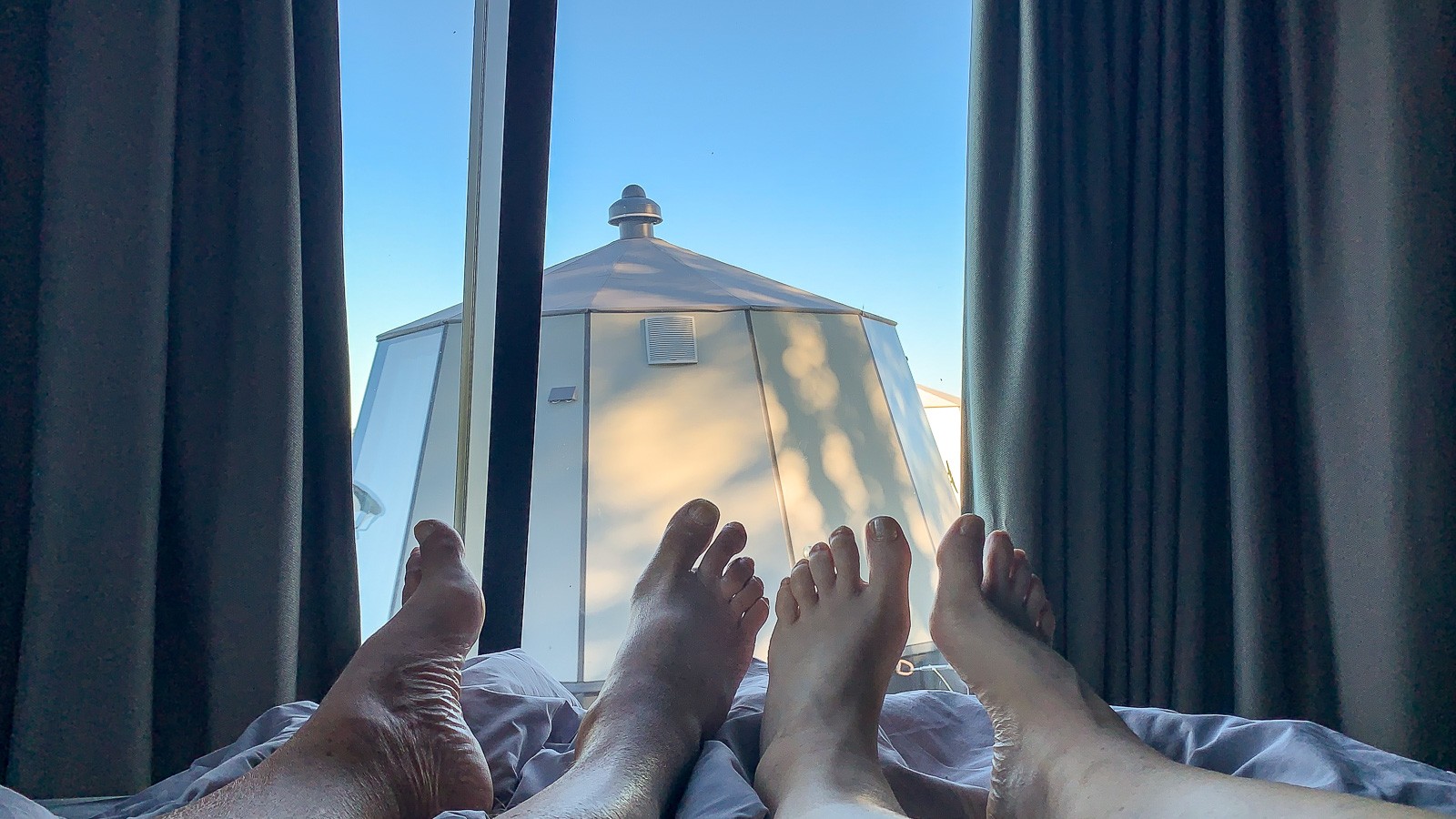 Helteisenä päivänä iltapäivän kuumimpina tunteina järvelle olisikin ollut käyttöä, sillä ilmastoinnista huolimatta iglussa oli melko lämmintä. Illan ja yön mittaan ilmastointi kuitenkin jaksoi pitää iglun halutun lämpöisenä – ja kuka sitä nyt kauniita kesäpäiviä sisällä viettäisi, vaikka puitteet vähän hienommat olisikin!