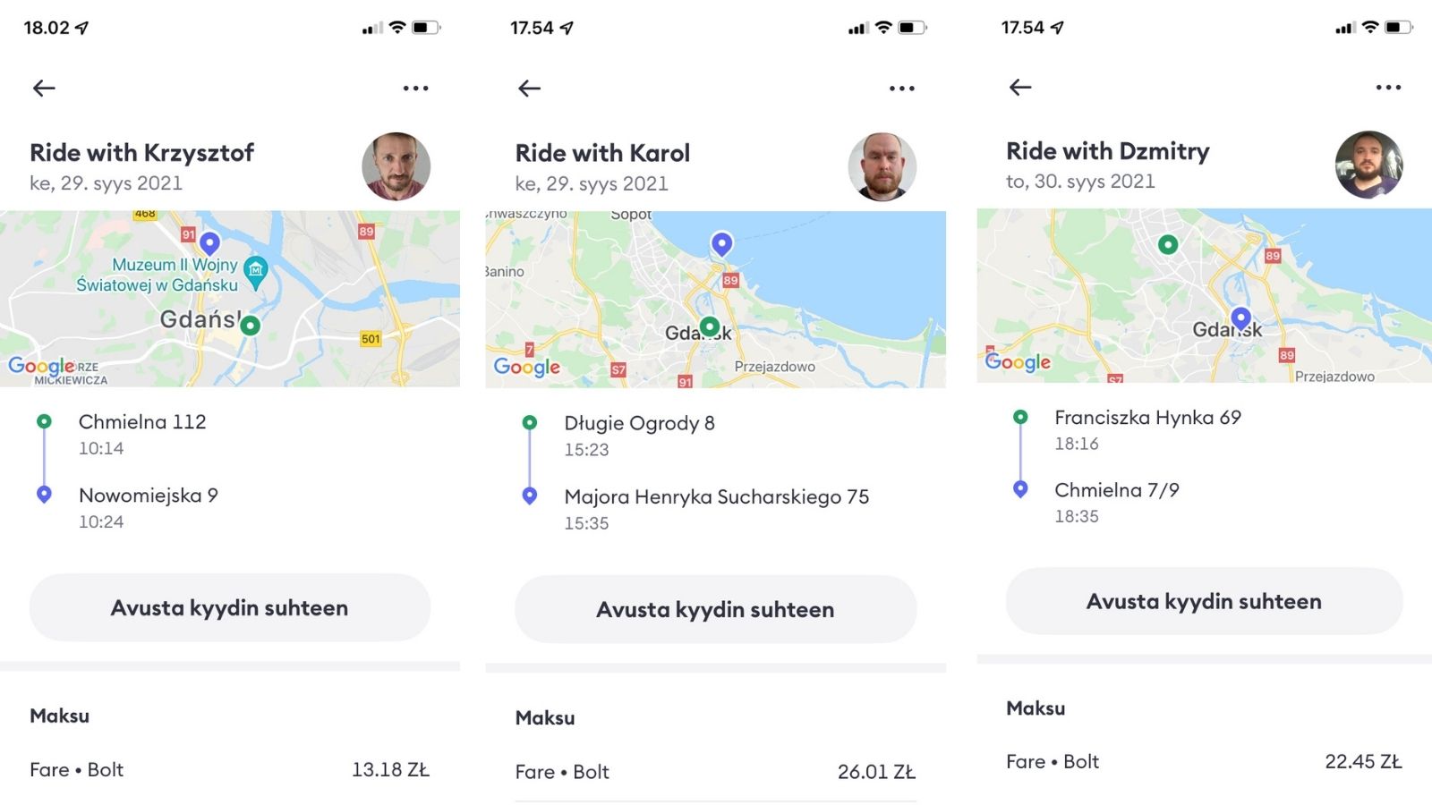 Gdanskissa liikuimme ihan keskustassa kävellen, mutta vähän kauempana oleviin kohteisiin kuten Europejskie Centrum Solidarnosciin (Euroopan solidaarisuuskeskus), Westerplattenille ja Zaspan lähiöön otimme Bolt-taksin, jotka olivat Gdanskissa edullisia ja lähes aina saatavilla muutamassa minuutissa. Paluumatkalle Westerplattenin niemeltä valitsimme turistilaivan siitä huolimatta, että matka sillä oli tietysti turistihintainen, mutta halusimme saapua kaupunkiin Motlava-jokea pitkin ja paluuhetkellämme tämä laiva oli juuri sopivasti lähdössä.