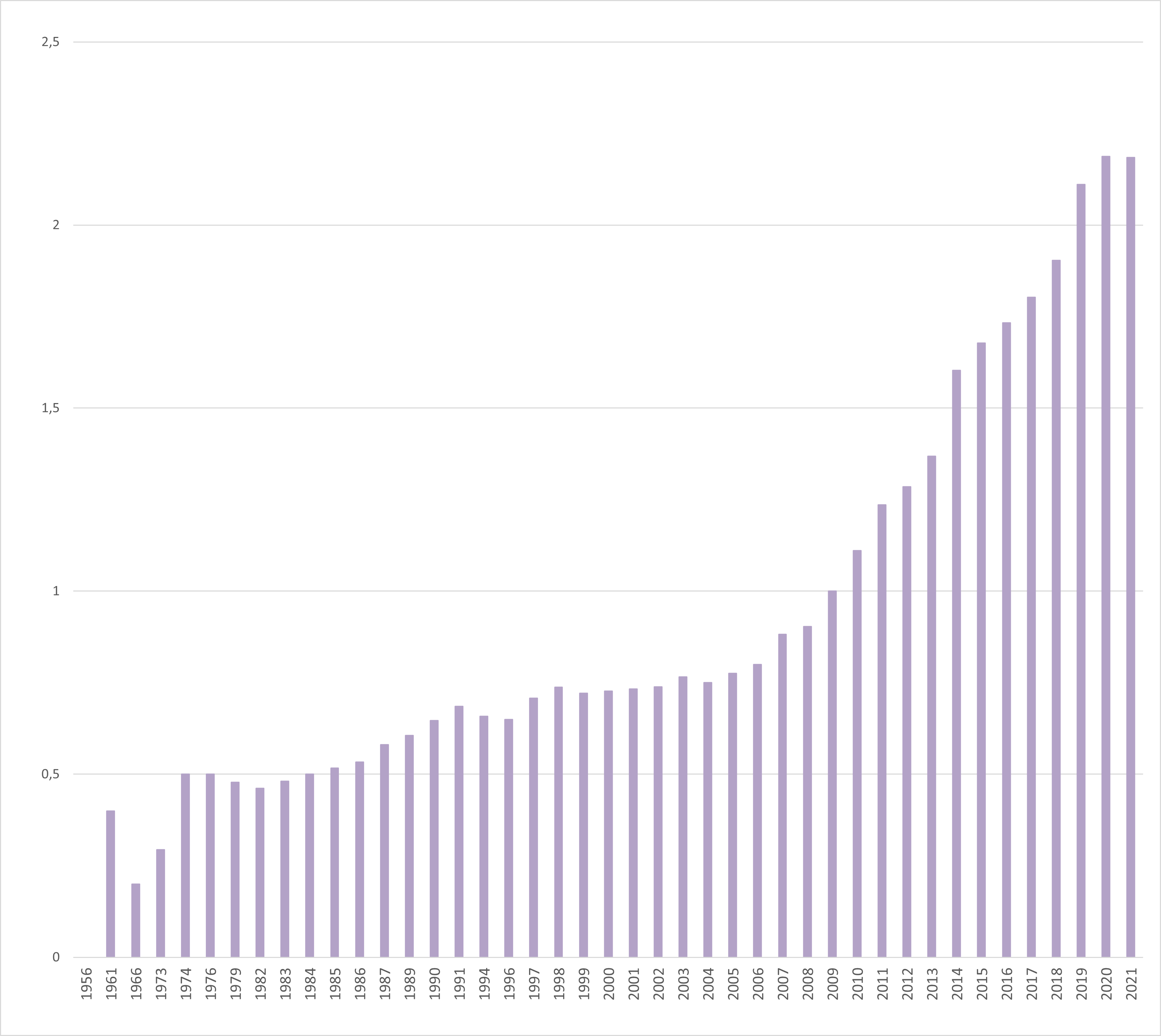 Maakerroin on laskettu YK:n jäsenvaltioista. Tasonousut tuossa ylläolevassa kuvassa selittyvät vuoden 2006 jälkeen S/Y Meriharakasta luopumisella, vuosina 2014 ja 2015 Pirkon runsaan puolen vuoden sapattivapaalla ja vuoden 2017 alusta Pirkon jättäydyttyä pois työelämästä.