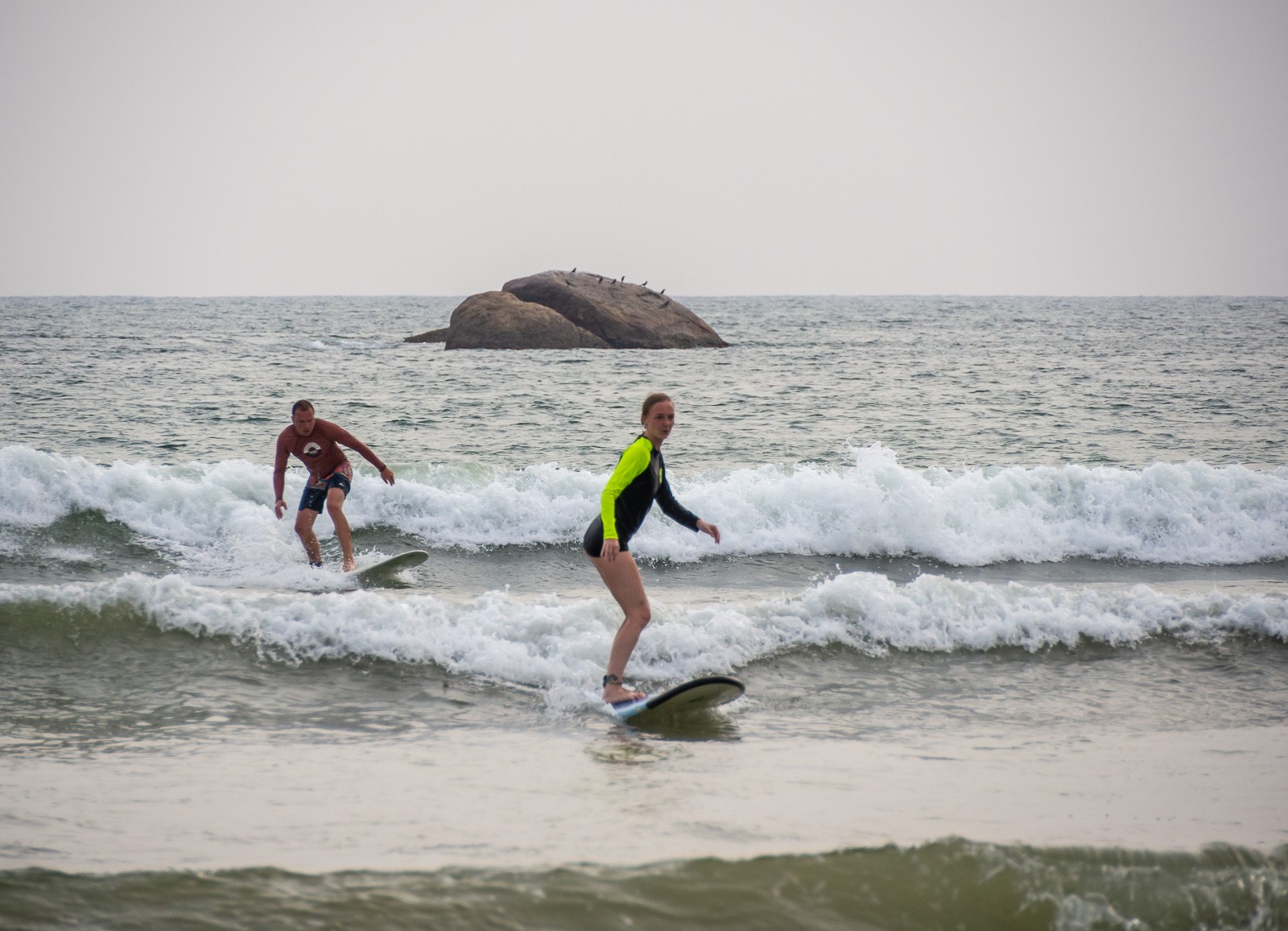 Weligamaa pidetään yhtenä Sri Lankan parhaista surffirannoista etenkin aloittelijoille. Rannalla olikin surffikouluja vieri vieressä ja reippaita nuoria lähes vuorokauden ajasta riippumatta harjoittelemassa rannalla laudoilleen nousemista. Myös rannan aalloilla näkyi aloittelevia tai vähän edistyneempiäkin surffareita aikaisesta aamusta myöhäiseen iltaan.