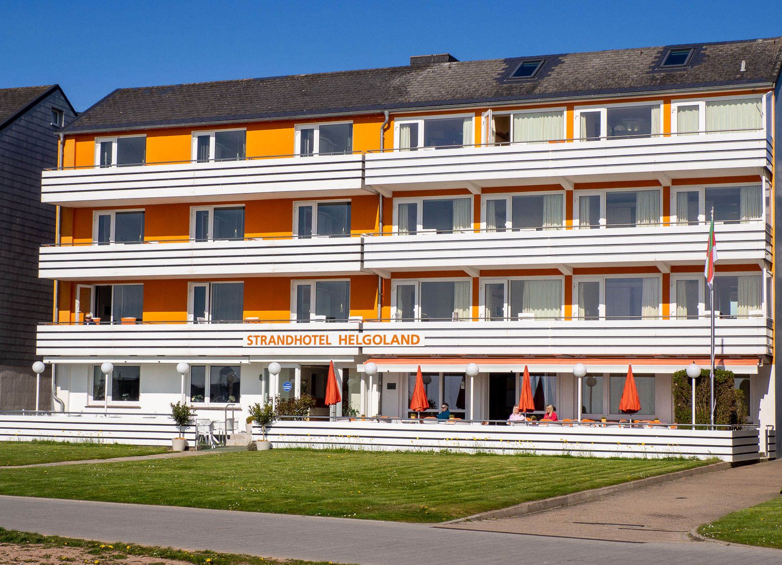 Värikkäissä pienissä taloissa oli kuitenkin pieniä matkamuistomyymälöitä ja muutama ravintolakin oli auki jo huhtikuussakin. Matkalla Nord-Ost-Hafenista etelärannalle olimme myös nähneet jo hotelleja vieri vieressä, eli voin vaan kuvitella miten paljon ihmisiä saarella on heinä-elokuussa. Rannalla näimme myös ensimmäiset ainakin Pohjanmeren saarille tyypilliset aurinkotuolit, joissa saattaa Pohjanmeren olosuhteissakin ehkä löytää sopivasti suojaa tuulelta. Myöhemmin näimme samanlaisia tuoleja myös Oberlandissa monen talon puutarhassa siinä missa Suomessa puutarhassa saattaa olla vaikka puutarhakeinu.