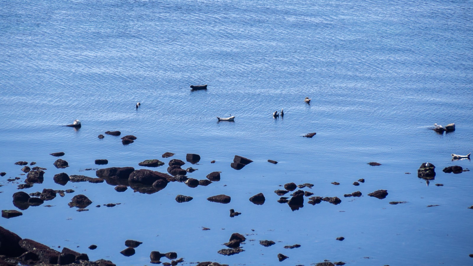 Saaren lounaisrannikon näkymät olivat upeat heti kun pääsimme rantatörmän reunalle. Matkaa alas rannalle on kymmeniä metrejä, taisin jostain lukea, että jopa 80 metriä, joten merellä näkemämme linnut erottuivat lähinnä siksi, että niitä oli niin paljon ja muutamat hylkeetkin näkyivät vain pieninä pisteinä, mikä tietysti vähän harmittikin. Mutta kun jatkoimme polkua eteenpäin aloimme erottaa valkoisina loistavat saaren luoteiskärjen kalliot ja tajusimme, että ne ovat valkoisinaan lintuja!