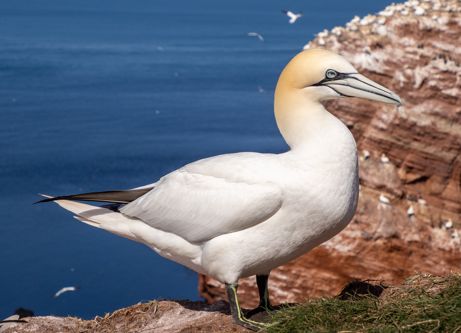 Valkoisia suulia oli satoja ja taas satoja ja tarkemmin kallionjyrkänteen reunoja tutkaillessamme näimme myös riveittäin ja taas riveittäin mustaselkäisiä etelänkiisloja. Luontopolku kulkee niin lähellä lintukallioiden huippuja, että linnut ja lintuja tarkkailevat turistit – no ehkä siellä muutama ihan lintuharrastajakin oli – ovat parhaimmillaan alle metrin etäisyydellä toisistaan. Lintuja saattoi siis paitsi kuvata vaikka ihan peruskännykällä myös tarkkailla lähietäisyydeltä. Kuvien kannalta haastavin ongelma oli, että jokaiseen lähikuvaan päätyi paitsi useita kokonaisia lintuja myös osia muista linnuista! Vietimme hetken myös vain tarkkaillen lintujen elämää ja näimme useampia mielenkiintoisia lintujen välisiä kohtaamisia. Pääsimme todistamaan, miten mereltä palaava lintu tuo puolisolleen (tulevalle puolisolle?) mehukkaan levän, näimme useamman pienen tai isommankin nahistelun ja myös intiimiä kanssakäymistä. Näimme me Lange Annankin lähietäisyydeltä, mutta sillä ei tosiaan ollut niin väliä – kuten olimme jo etukäteen jo vähän arvelleetkin.