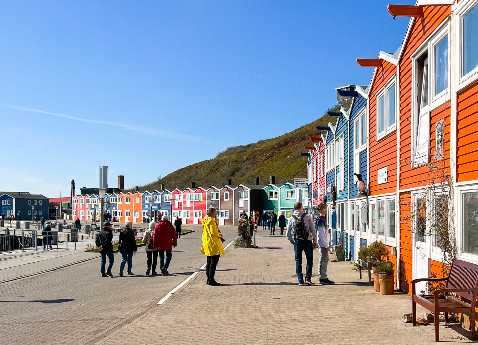 Rantauduimme M/S Hamburg -laivan pelastusveneellä hiukan sivummalle, Helgolandin akvaarion eteen Nord-Ost-Hafeniin, josta laivan henkilökunta opasti ihmisiä Oberlandiin vievälle hissille. Omissa mielikuvissani siinteli kuitenkin pienten värikkäiden rantatalojen rivistö, jonka halusin nähdä ensimmäiseksi – suuntasimme siis hissin sijaan Südstrandille ja kohta värikkäiden talojen rivistö jo näkyikin.