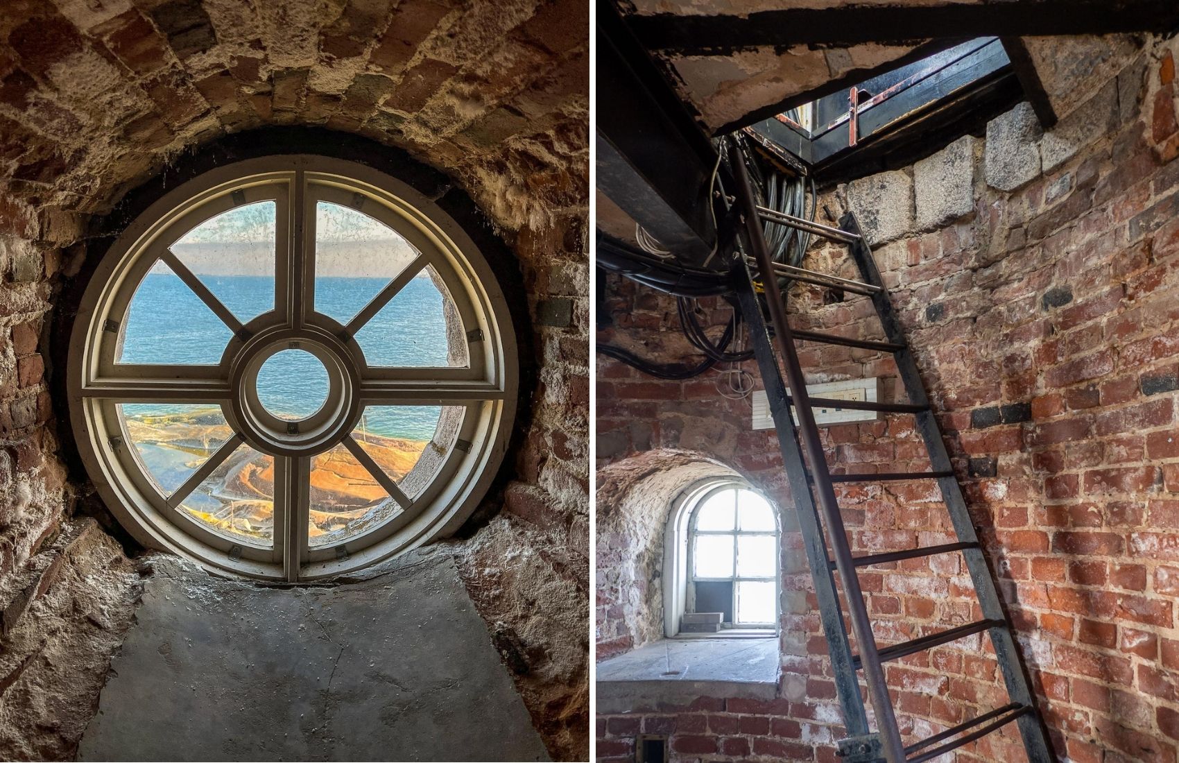 Pohjoismaiden korkeimpaan majakkaan (52 metriä) kiipeämisen jätimme senkin suosiolla aamuun ja annoimme päiväretkeilijöiden tungeksia portaissa ja tikkaissa tulopäivänä. Majakalla asuvien ja työskentelevien joukosta joku on kuulemma noussut 252 askelmaa majakan huipulle oliko nyt 45 sekunnissa, kuitenkin alle minuutissa, mutta emme lähteneet yrittämäänkään kyseisen ennätyksen lyömistä. Sen sijaan pysähtelimme melkein jokaisen majakan ikkunan luona katsellen joko sen edustalle koottuja museoesineitä tai maisemia merelle. Kierreportaiden osuus on itse nousua lukuunottamatta kesy, mutta toiseksi viimeiset tikkaat vaativat jo vähän keskittymistä ja ehkä kameran tai olkalaukun asettelua siten, etteivät ne jumita pienehkössä aukossa. Ihan viimeiset portaat ovat sitten jo taas helpot.