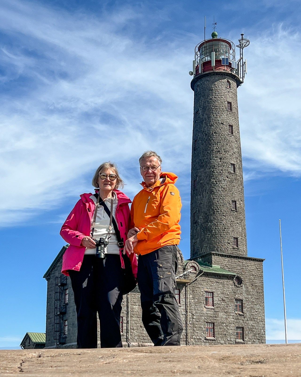 Upea kuva teistä värikkäissä takeissa harmaata majakkaa vasten!