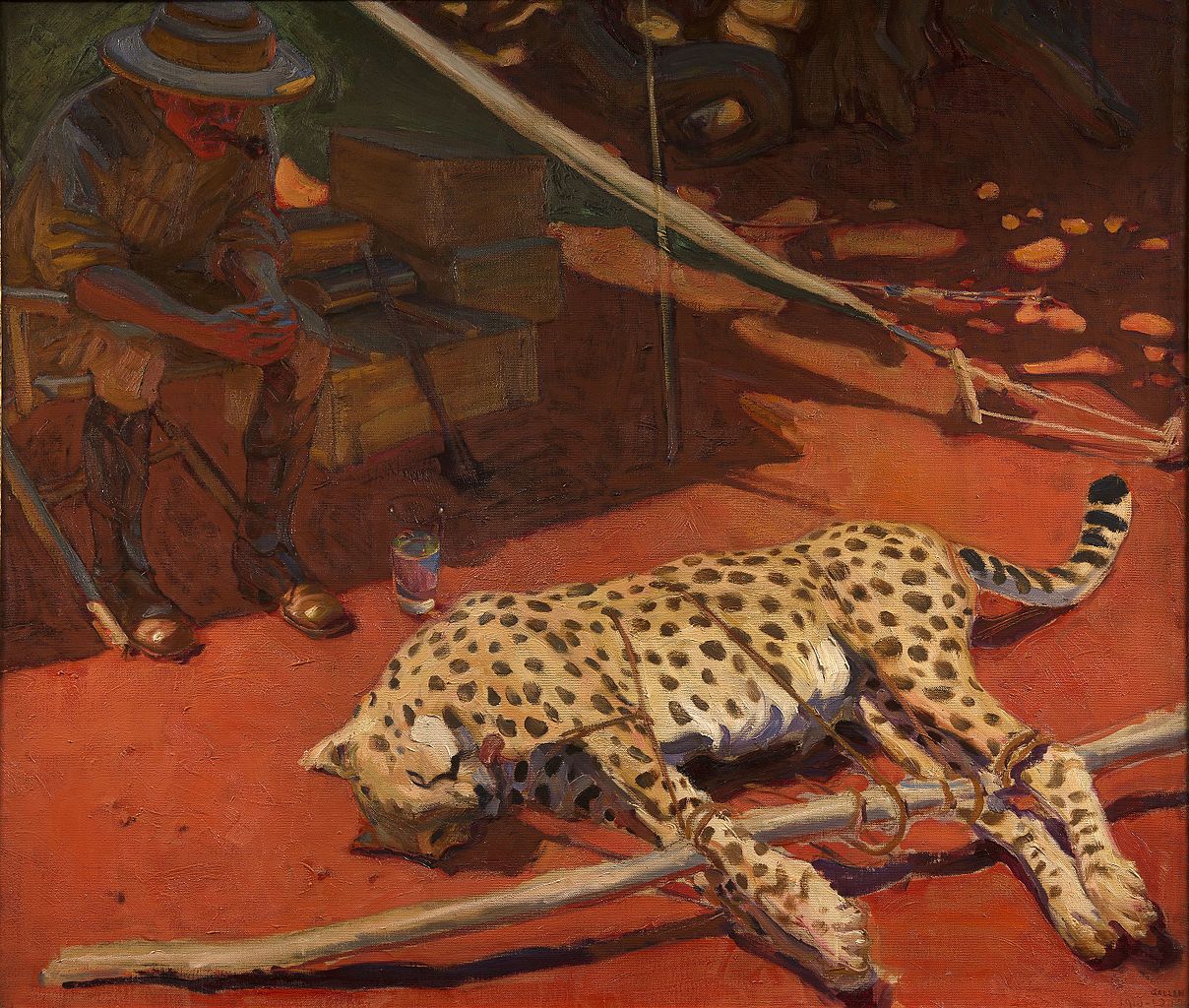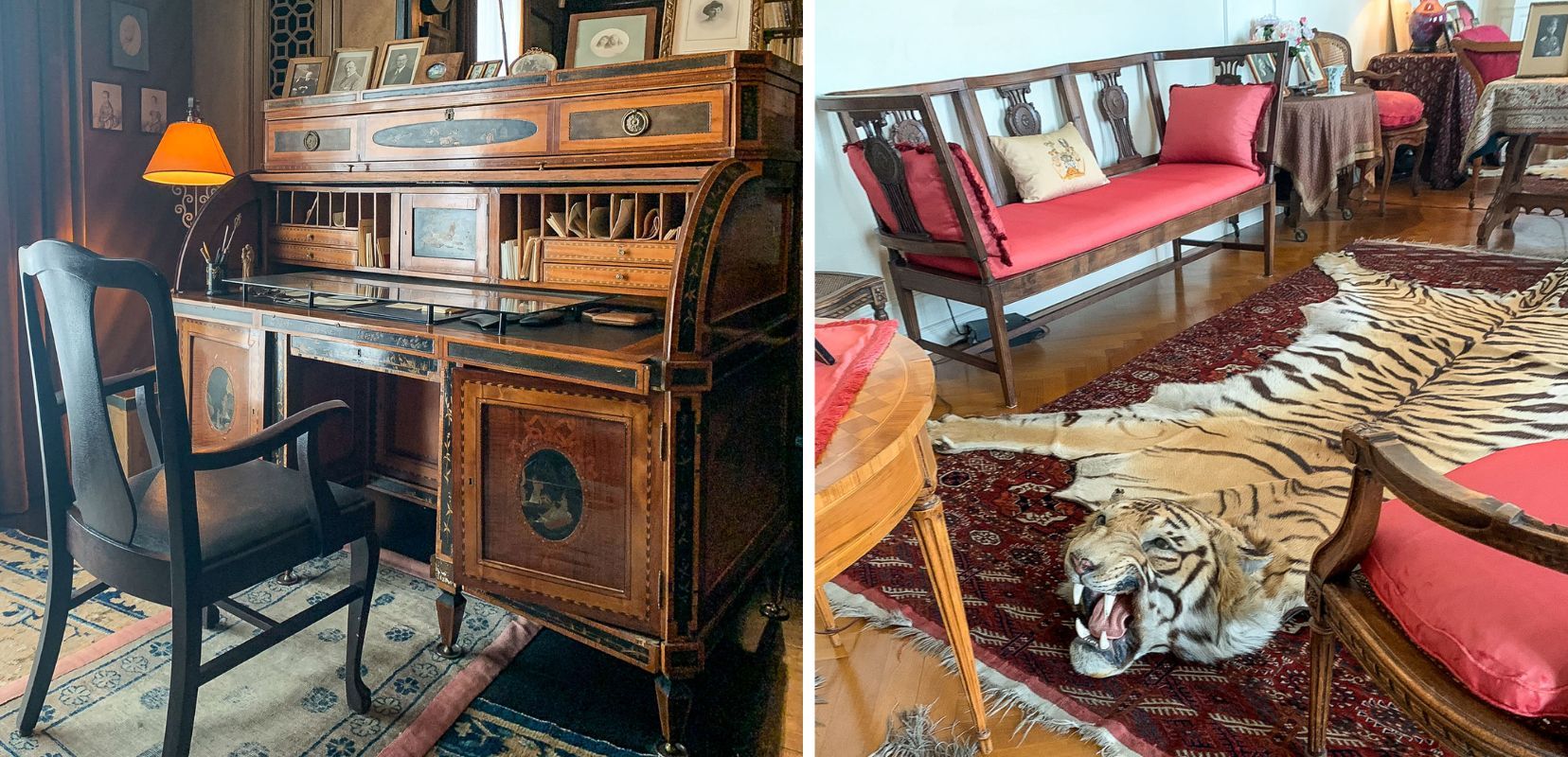 Mannerheim, Akseli Gallen-Kallela, 1929, CC BY-SA 4.0, via Wikimedia CommonsSeuraavassa huoneessa, salongissa, huomio kiinnittyy erityisesti kahteen isoon tiikerin taljaan. Opas viistoilee, että voisi luulla, että toinen niistä on pieni tiikeri ja toinen iso, mutta itseasiassa pienikin tiikeri on iso ja se isompi on vaan ollut hyvin iso tiikeri!