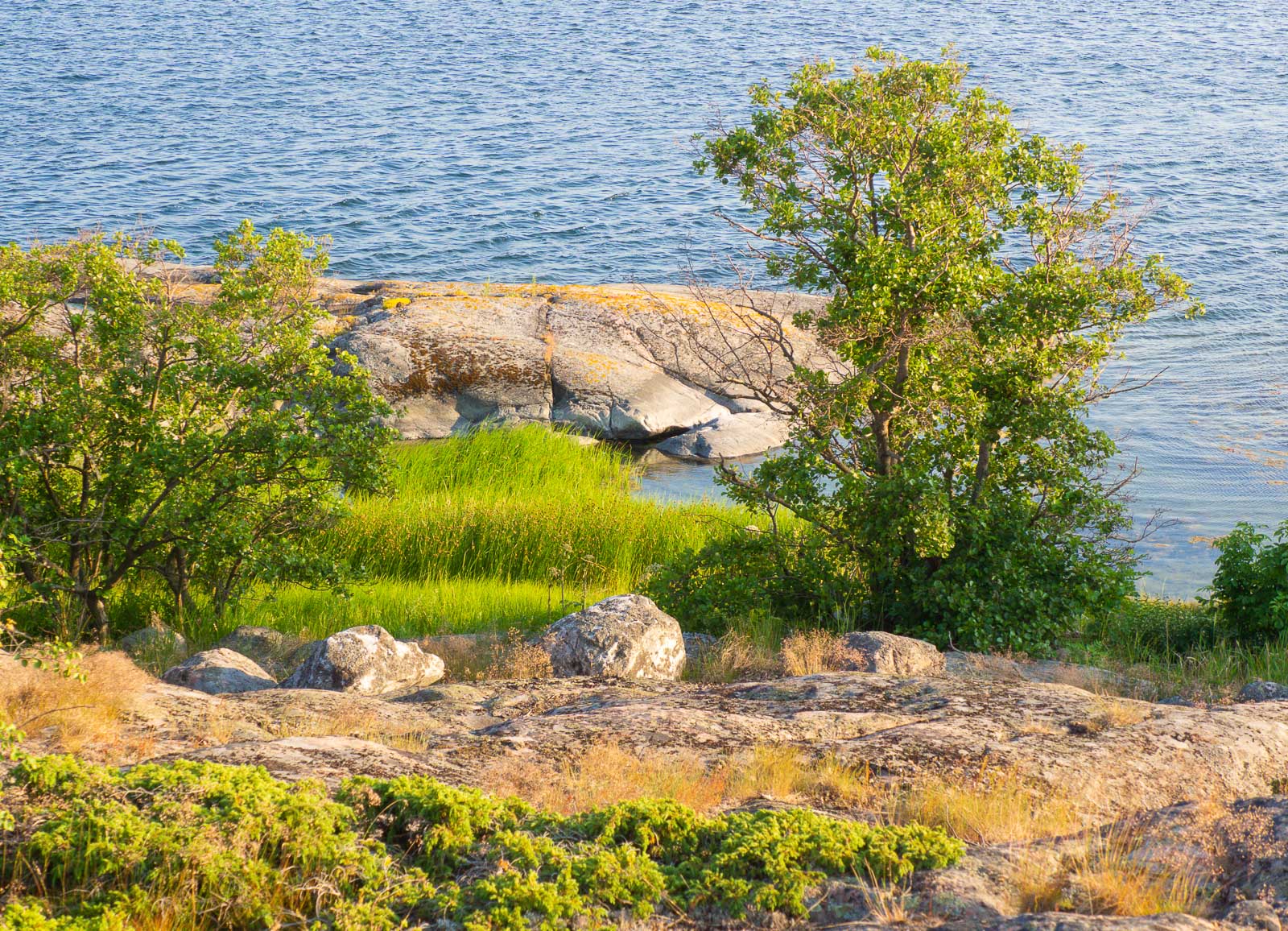 Pienen saaren keskiosa on läpitunkematonta katajaa, mutta etenkin saaren länsirannoilla kelpaa kulkea. Onneksi on ihan kuivaa, niin kalliot eivät ole liukkaita. Keltainen maksaruoho kukkii, samoin ruoholaukka ja sinikeltaiset orvokit. Rantavesissä on siellä täällä rakkolevää, jota kai väitetään sen merkiksi, että vesi on puhdasta. Loivat kalliot laskevat mereen ja liukastelemme vesirajassa onkiessamme vähän merivettä mökin edustalle pieneen laatikkoon pieniin tiski- ja käsienpesutarpeisiin. Myöhemmin illalla ja seuraavana aamuna palaamme rannan kallioille, liukastelemme taas mereen huuhtoaksemme illalla päivän pölyt tai aamulla unihiekan silmistämme. Saarella ei ole suihkua, mutta onhan täällä meri, joka puolella! Tällaista se oli lapsuudenkin kesinä, mieluummin mereen kuin saunaan. Purjeveneessämmekään ei missään vaiheessa ollut suihkua, joten luonnonsatamissa suihkuna toimi meri – tosin veneen portaita pitkin sinne oli helpompi laskeutua tai ainakin nousta sieltä kuin saaressa.