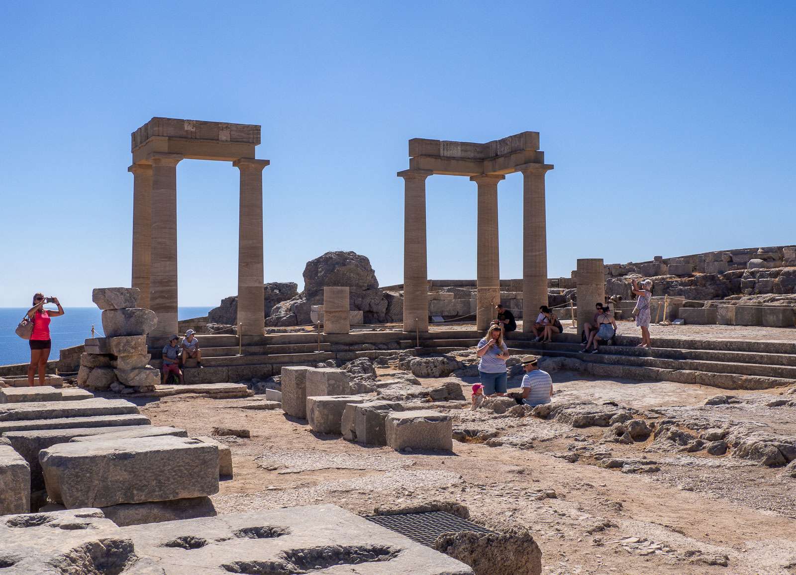 Reliefilaivalta nousimme keskiaikaiset portaat keskiaikaiseen pieneen linnoitukseen. Samassa rykelmässä sen kanssa on vanha bysanttilainen kirkko ja vasta sen läpi kuljettuamme olemme antiikin Kreikassa. Täällä on kreikkalaisia holvikaaria, roomalainen temppeli ja stoalle, avoimelle pylväshallille, vievät ensimäiset portaat. Seuraavissa, propylaialle, monumentaaliportille, vievissä portaissa katse kannattaakin nostaa ylös, kohti taivasta. Hetkeen ei muuta näekään kuin taivaan, sillä arkkitehtuuri onkin tavoitellut “Stairway to Heaven” vaikutelmaa. Ylimmällä tasolla on Athena Lindian temppeli – ja huikeat näköalat merelle kaikkiin suuntiin – olemmehan 116 metrin korkeudella.