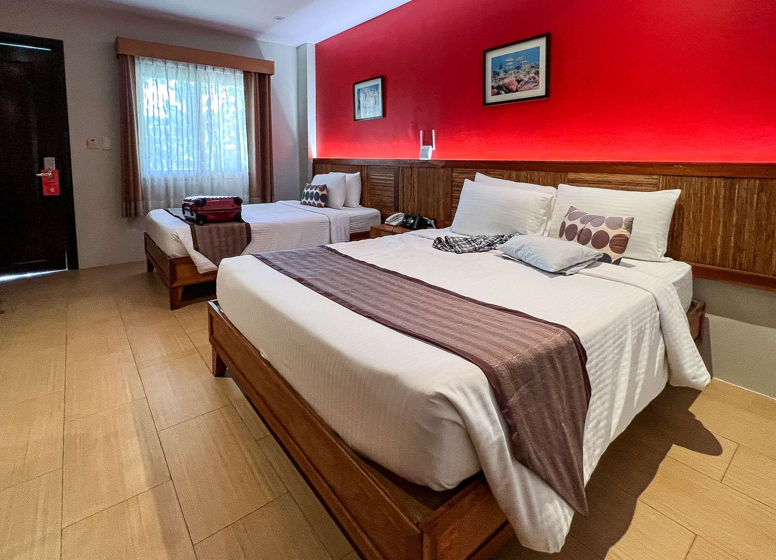 Aktiv-Resorin kanssa käytyjen muutaman suunnittelukierroksen yhdessä vaiheessa päätimme pitää Bangladeshin hotellit 4 tähdessä, mutta tiputtaa Filippiinien hotellit 3+ tähteen. Ajattelimme Bangladeshin ja erityisesti Dhakan olevan sen verran kaaottinen paikka, että hyvä hotelli olisi hyvä veto. Hotel Sarina ei ollut puitteiltaan varsinaisesti loistokas, tilat olivat jo ehkä vähän kulahtaneita enkä erityisesti rakastanut sisätilojen tummaa tyyliä, mutta kaikki toimi, ilmastointi ja suihku nyt tärkeimpinä. Hotellissa oli useampia ravintoloita ja aamiaisella tuli loistavasti toimeen ja lähellä oli pieni supermarket. Ympäristö oli dhakalaiseen tapaan odotusten mukaan melko kaaottinen, mutta oli lähellä ihan kelvollisia pienempiä katujakin käveltäväksi, ainakin perjantai-aamuna, siis paikallisena sunnuntai-aamuna. Läheisessä Sheratonissa ei olisi enää ehkä kokenut edes olevansa Bangladeshissä, sen verran vakioituna nämä isompien ketjujen 5 tähden hotellit ovat jokaisessa maassa. Tosin Sheratonin kattouima-altaasta olisin vähänkin pitemmällä vierailulla melkein maksanut neljän ja viiden tähden hotellin välisen hintaeron, mikä se nyt sitten olisi ollutkaan!