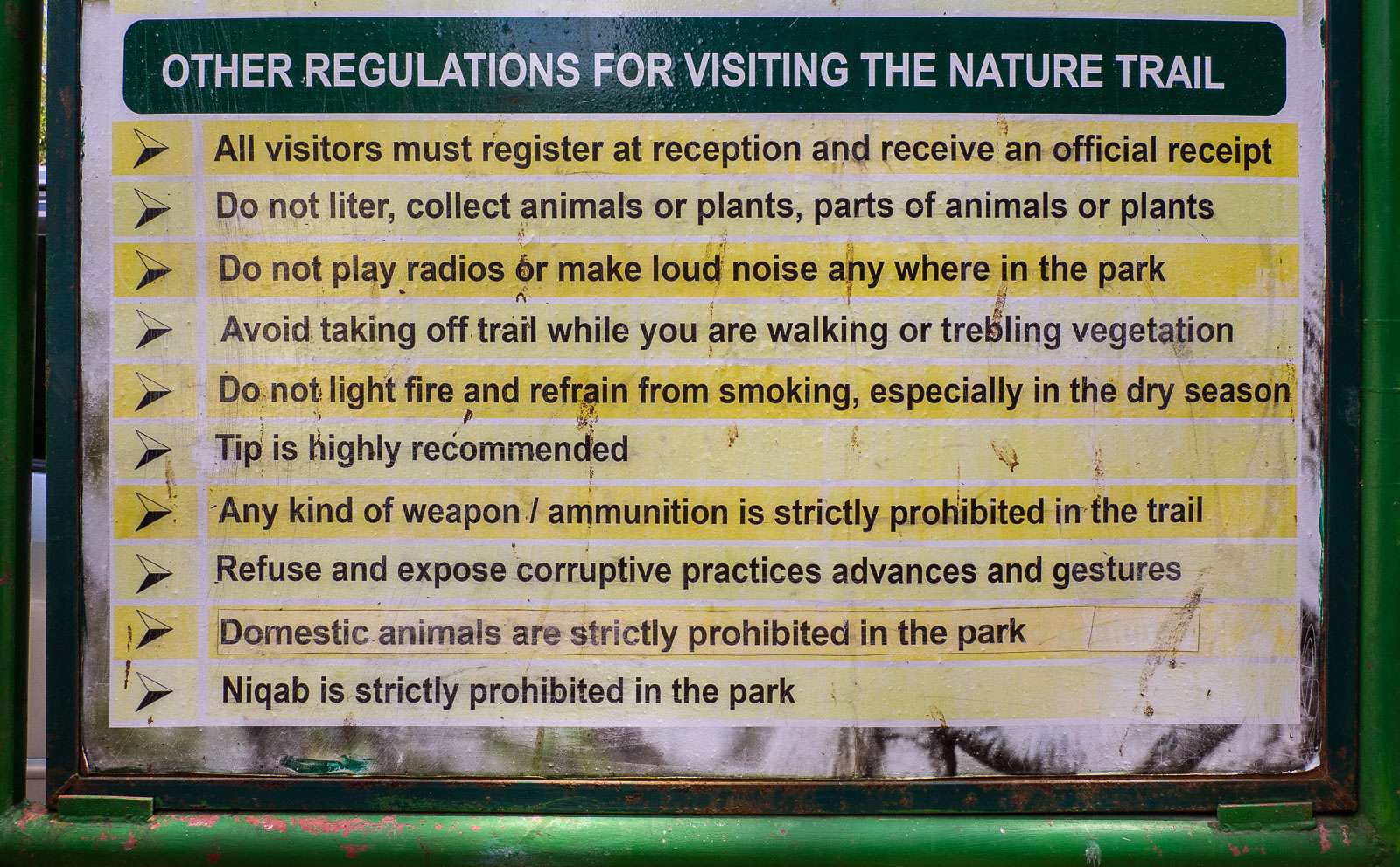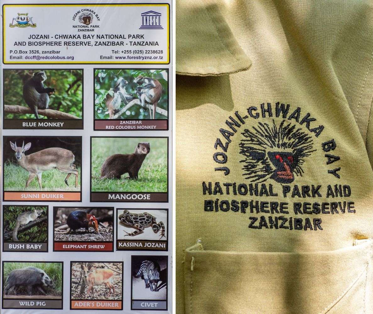 Kävelyretki Jozanin metsässä jakaantuu kahteen osaan: metsäkävelyyn, jonka varrella kohtuullisen todennäköisesti näkee myös ainakin yhden lauman sansibaringueretsoja, ja kävelyyn mangrovemetsässä, jonka eläimistöä ovat ravut ja linnut. Ennen ensimmäistäkään askelta itse metsässä oppaamme seisotti meidät puiston käyttäytymissäännöt esittelevän taulun äärelle, odotti hetken ja tarkisti, että olemmeko ymmärtäneet kaiken. Tein vielä tarkentavan kysymyksen, että miksi niqabin, eli pään kokonaan peittävän mustan hunnun, käyttö puistossa oli kielletty. Kuulemma siksi, että apinat saattavat heittäytyä uteliaiksi, että mitä hunnun alla on ja tulla nostelemaan sitä!