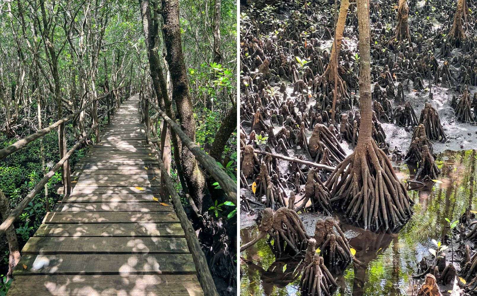 Läheiseen mangrovemetsään olikin sen verran matkaa, että vierailijat tapaavat taittaa sen autolla. “Oma” kuljettajamme ajoikin meidät ja puisto-oppaamme seuraavaan kohteeseemme. Mangrovemetsään pääsimme tutustumaan suon ylle rakennettuja puisia käytäviä pitkin. Mustasta mudasta allamme nousi vihreitä mangrovepuita – tai tarkkaan ottaen alueella kasvaa kuulemma valkoista, punaista ja mustaa mangrovea, tosin kaikki siis vihreitä lehdiltään. Kukinnot ja hedelmät ovat eri lajeilla erilaisia.
