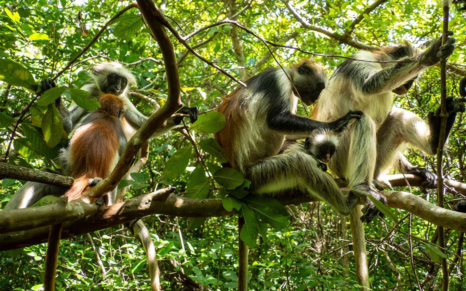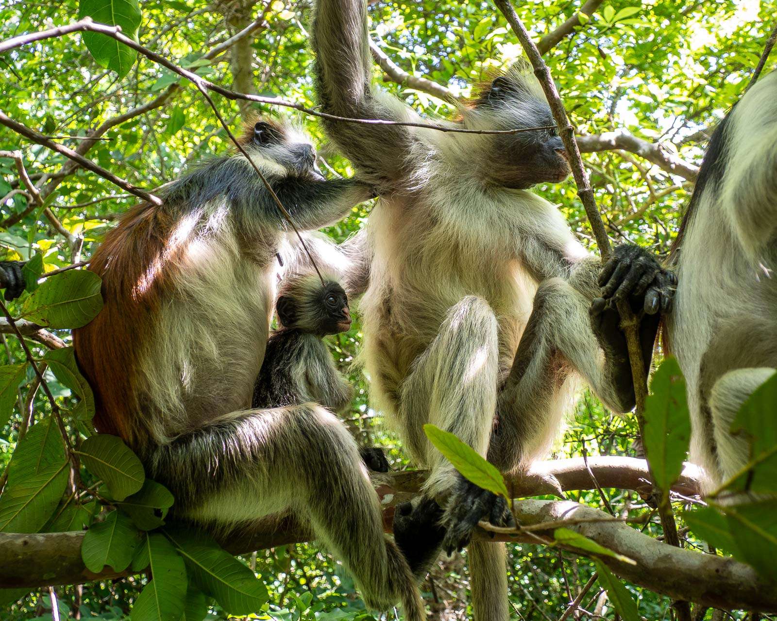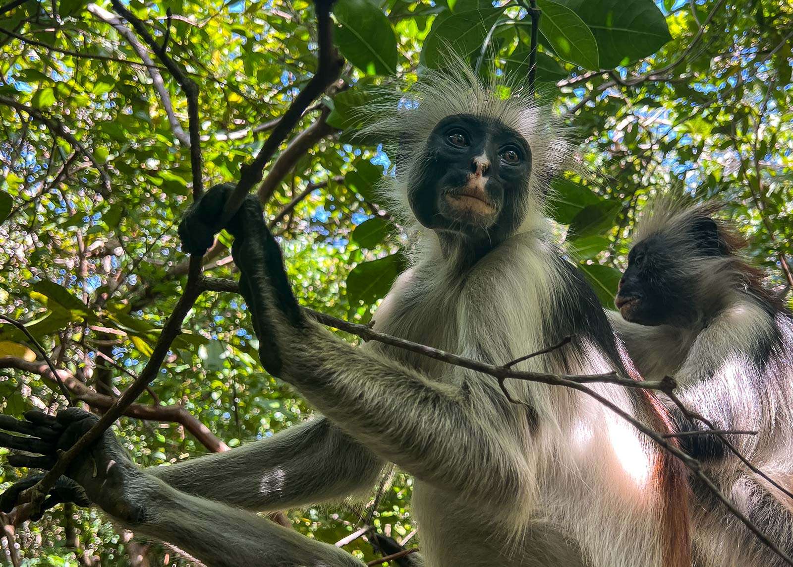 Tähän asti olimme liikkuneet metsässä kahdestaan oppaamme kanssa, mutta nyt näimme edessämme pienen ryhmän verran ensin ihmisiä ja sen jälkeen jo kohta sansibaringueretsoja. Läheisessä melko tiheässä pensaikossa oli useampi yksilö, joukossa myös ainakin yksi ihan pieni. Ohjeemme olivat olleet, että kovin lähelle apinoita ei pidä mennä, mutta käytäntö näytti olevan toinen – oppaat lähes työnsivät meitä lähemmäs apinoita: you can get a great selfie! No, ainakin apinat olivat vapaita ja olisivat voineet halutessaan vaihtaa maisemaa.