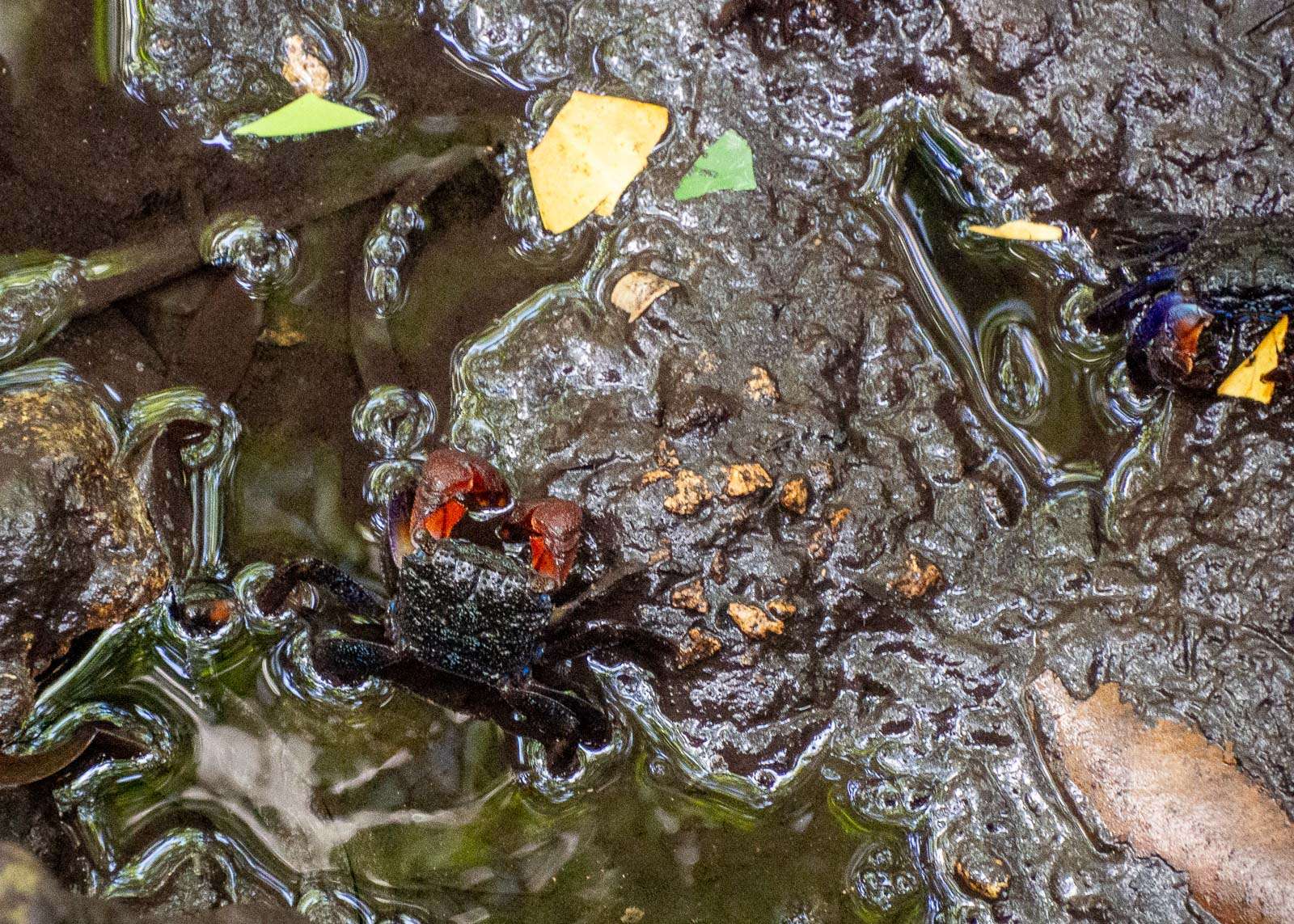Välillä pysähdymme kohdissa, joissa vesi on ehkä äskettäin vähän vetäytynyt ja oppaamme osoittaa kuoppia mudassa, näettekö, rapuja! Näemmekin, kunhan joku ne ensin meille osoitti. Muutamia valkoisia haikarannäköisiä lintujakin näemme aluetta halkovissa puroissa, mutta sen verran kaukaa, etteivät oikein tartu kuviinkaan.