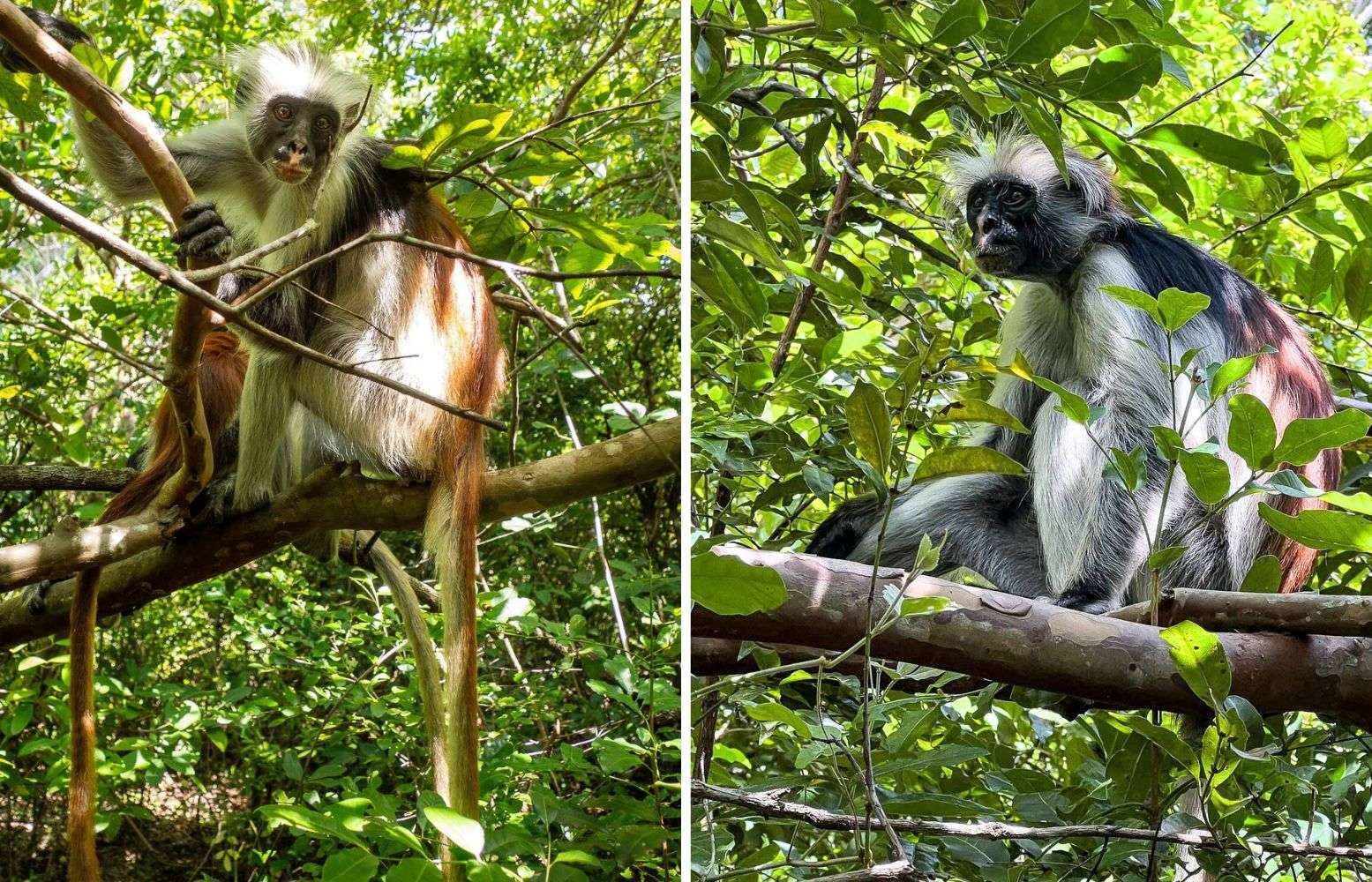 Sansibaringueretsat ovat apinoina ehkä keskikokoisia, mutta niiden valkoiset hännät olivat tosi pitkiä. Niiden kasvot olivat hätkähdyttävän ihmismäisiä, karvattomia – toisin kuin vaikka tapaamamme sinimarakatin naama. Kuten vaikka koalat Australiassa näidenkin apinoiden uhanalaisuus liittyy niiden käyttämään ravintoon. Tällaisia monipuolisesti erilaisia puita sisältäviä isohkoja metsäalueita on Sansibarillakin yhä vähemmän, mutta Jozanin metsässä niille on sentään vielä tilaa ja ruokaa. Puistossa lajia myös tutkitaan ja kannan tilannetta seurataan jatkuvasti. Nykyisin populaation kooksi arvioidaan jotain 1600 ja 3000 yksilön välillä.