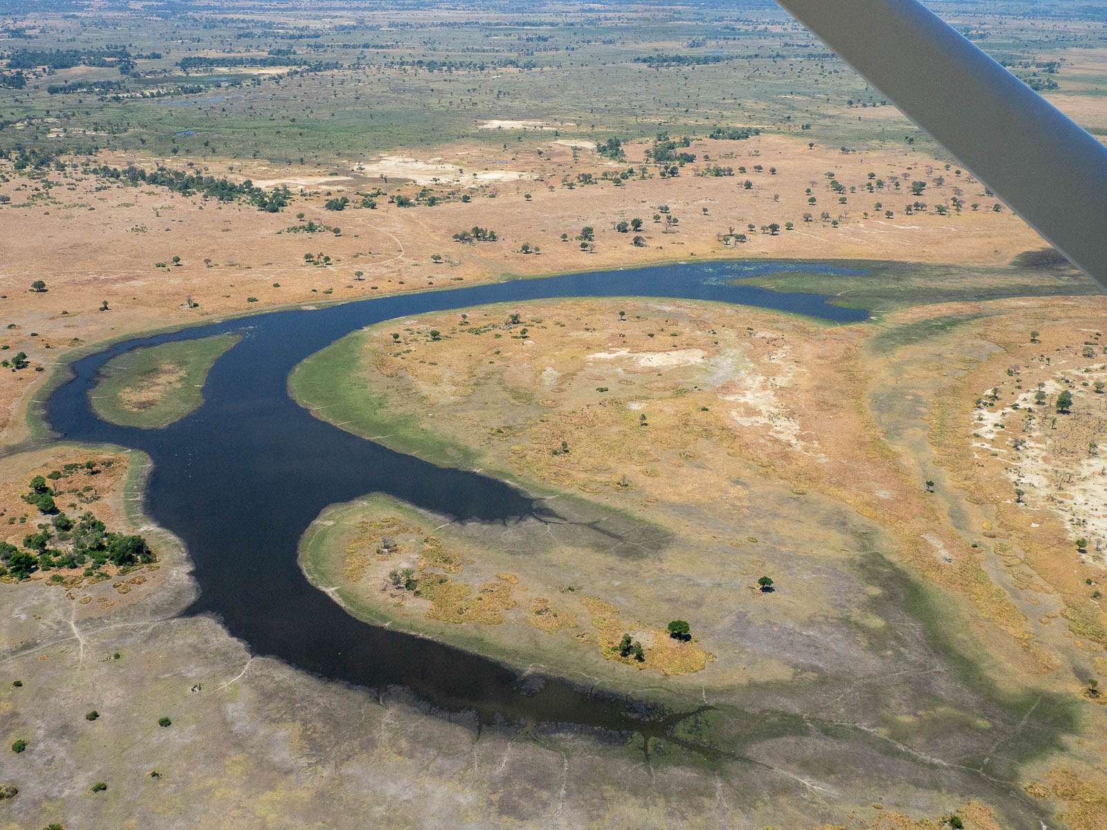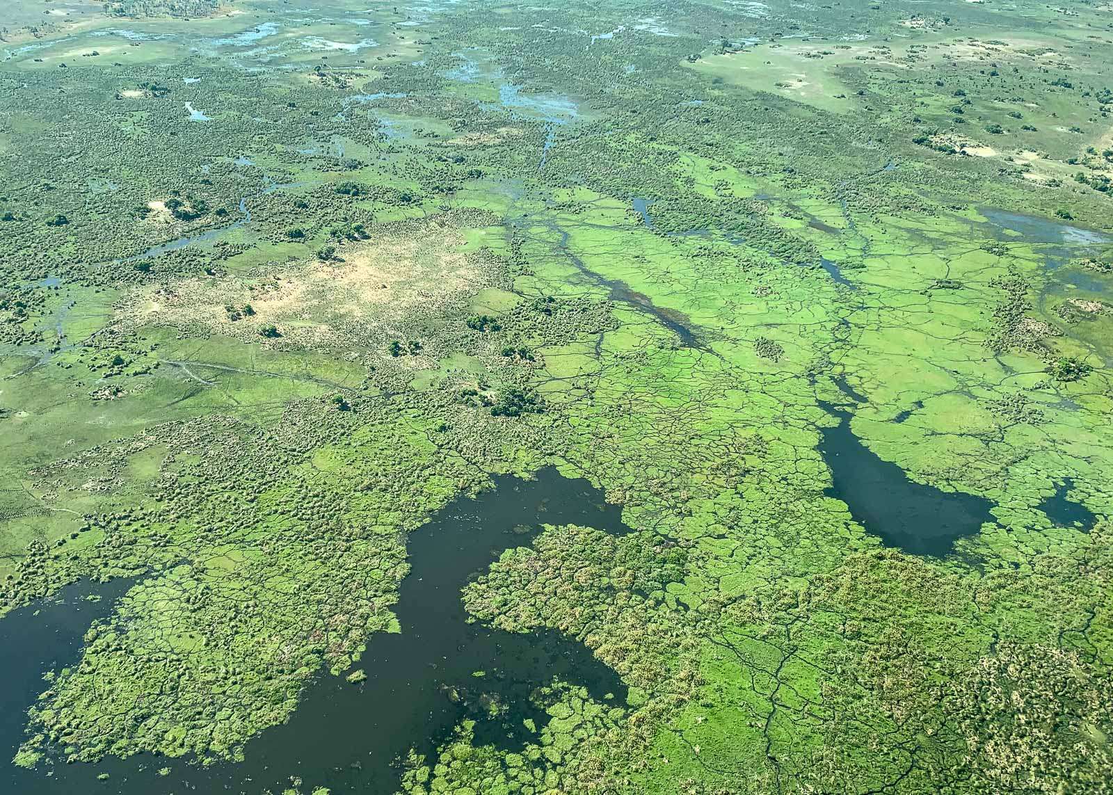 Maunista lähdettyämme allamme avautui keltaisen ja kuivan näköinen tasanko, jota riittää silmän kantamattomiin. Olimme liikkeellä marraskuussa ja tänä vuonna vettä oli kuulemma ollut tavallista vähemmän. Lentäessämme pohjoiseen maisema allamme käy vihreämmäksi, täällä sitä vielä riittää, vettä. Okavangon suisto Botswanassa on 33 000 hehtaarin laajuinen harvinainen sisämaan suistoalue, joka saa vetensä Angolan ylängöiltä, Okavango-joki ei siis pääty mereen vaan kaikki suistoon saapuva vesi jää alueelle useammaksi kuukaudeksi ja lopulta haihtuu. Alue on mm. vaikeakulkuisuutensa takia säilynyt koskemattomana ja sen myötä sen arvo yhtenä maailman merkittävimpinä luontokohteina on vaan noussut. Suistoalue onkin Unescon maailmanperintökohde.
