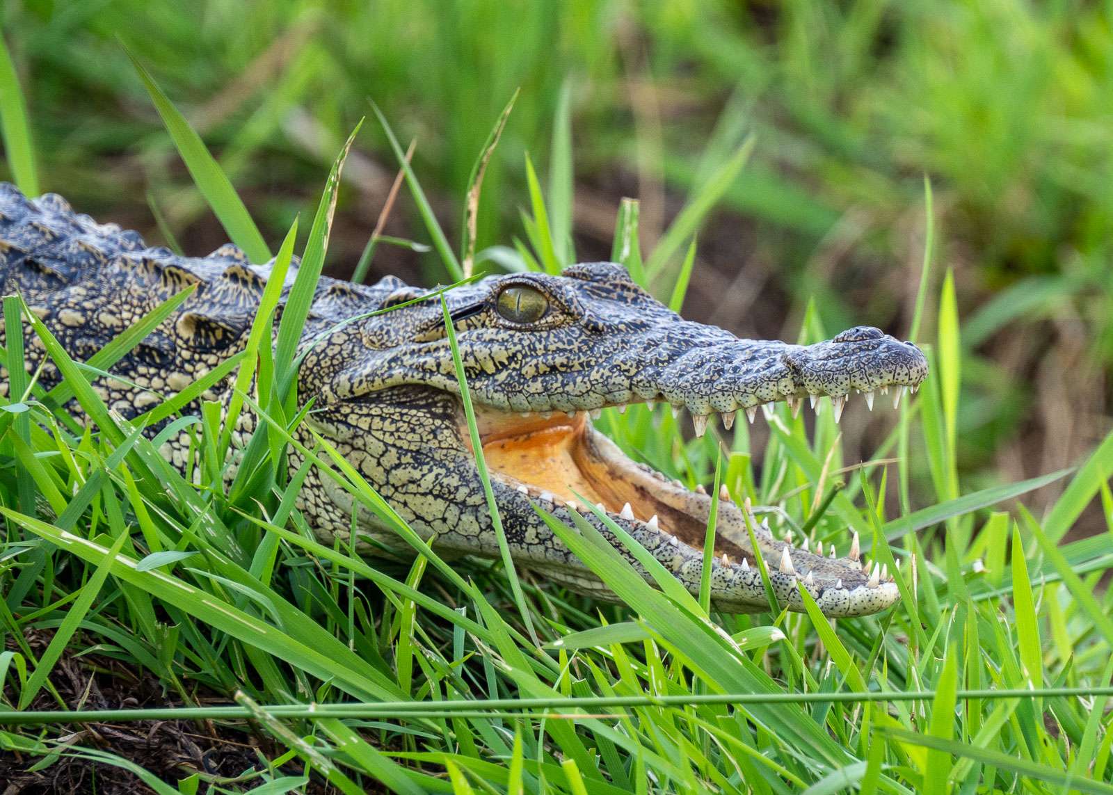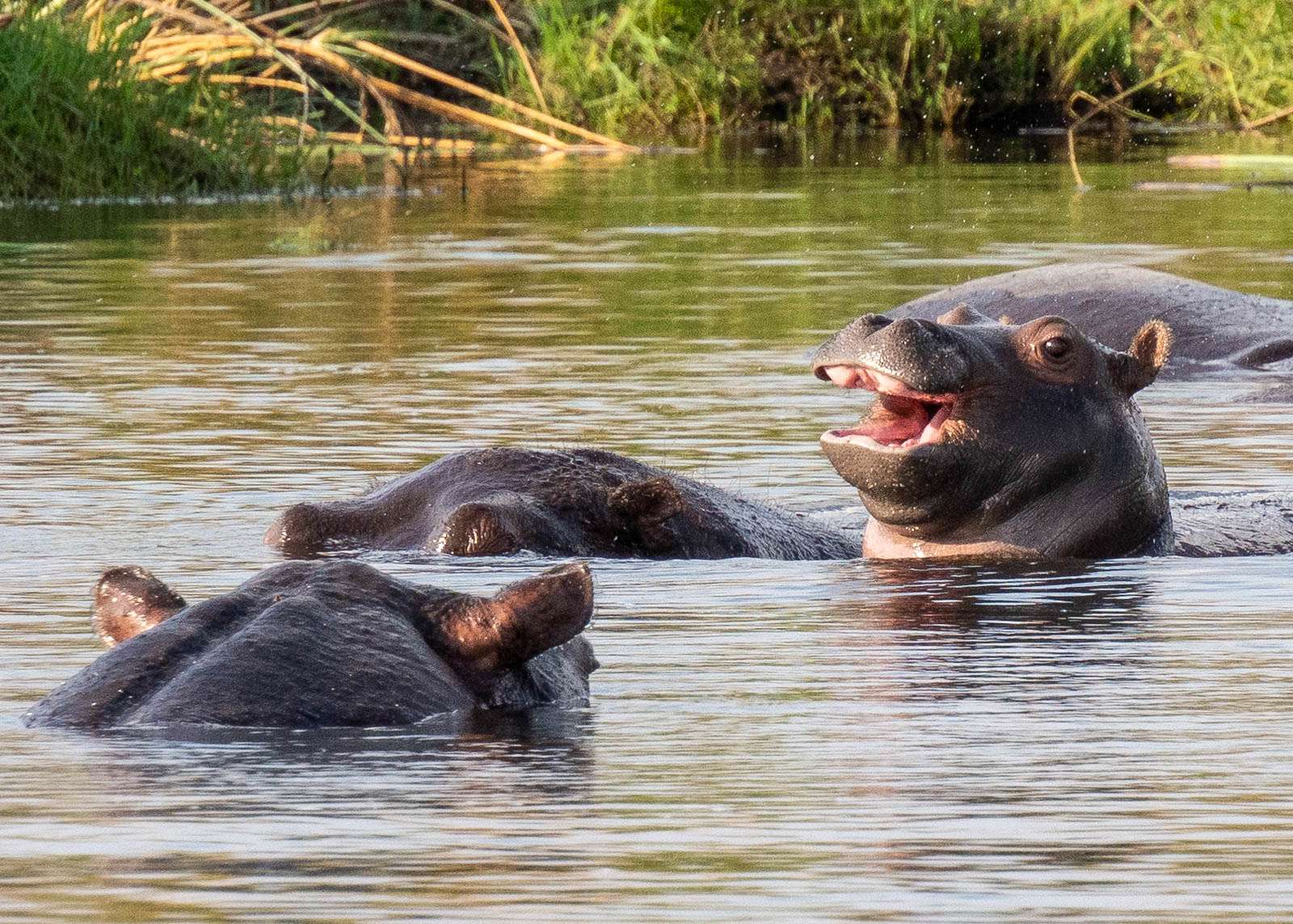 Virtahevoista saatoimme ensin nähdä joen mutkassa yhden tai pari, jotka nekin sitten painuivat välillä veden alle. Seuraavassa hetkessä niitä nousi vähän eri suunnalta veden pinnalle useita ja kohta ehkä ne ensimmäisetkin taas uudelleen. Parhaimmillaan oppaamme taisivat laskea samalla alueella olevan parikymmentä virtahepoa. Matkan jatkuessa seuraavassa joen mutkassa saattoi taas olla niitä lisää. Paikallis- ja lajituntemusta näillä vesillä liikkuminen kyllä selvästi vaatii, sillä välillä veneen jarruttaessa me, satunnaiset turistit, emme nähneet ensin mitään, mutta hetken päästä vedestä nousi yksi jos toinenkin pää. Ihan keskelle virtahepolaumaa ei pienellä moottoroidullakaan veneellä kannata ajaa. Virtahepohan on leppoisasta olemuksestaan huolimatta tarvittaessa nopea ja sen isojen hampaiden uhriksi päätyykin vuosittain satoja ihmisiä. Voi olla, että malariaa levittävät hyttyset ovat edelleen suurimpia tappajia Afrikassa, mutta virtahevot tulevat niiden jälkeen heti kakkosena vaarallisuudessaan.