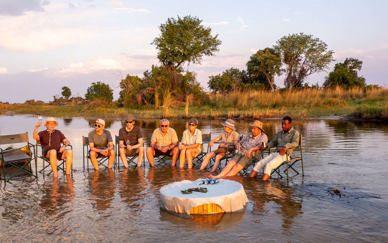 Veneretken päätteeksi nautimme samaisella pienellä joella sundownerit jokeen perustetusta baarista. Retkemme aikana leirin väki oli perustanut paikalle hyvin varustellut baarin ja asetellut retkituolit puolikaaren muotoon matalaan joenmutkaan.