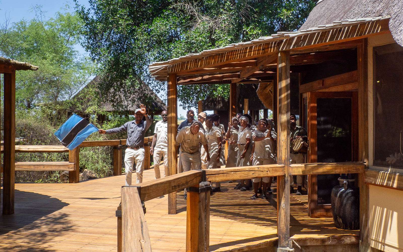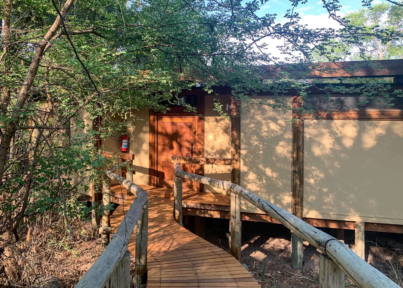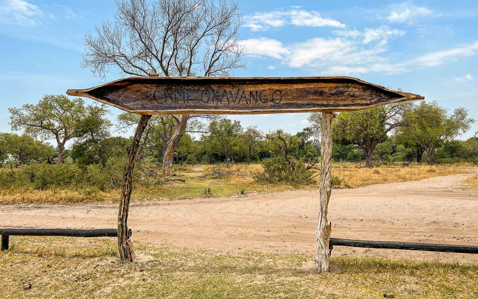 Camp Okavango onkin sitten jo niin suistoalueella, että autolla kiitoradalta leiriin kulkivat vain matkatavarat – me muut kävelimme noin 5 minuutin matkan, pääosin puisia kävelysiltoja pitkin. Koska ymmärsin, että autoteitä täällä ei ole, paitsikin juuri kiitoradalta leirin huoltoalueelle, niin kysyin, että miten tuo yksi safari auto on tänne tullut. Kuulemma laivalla, korkean veden aikaan.
