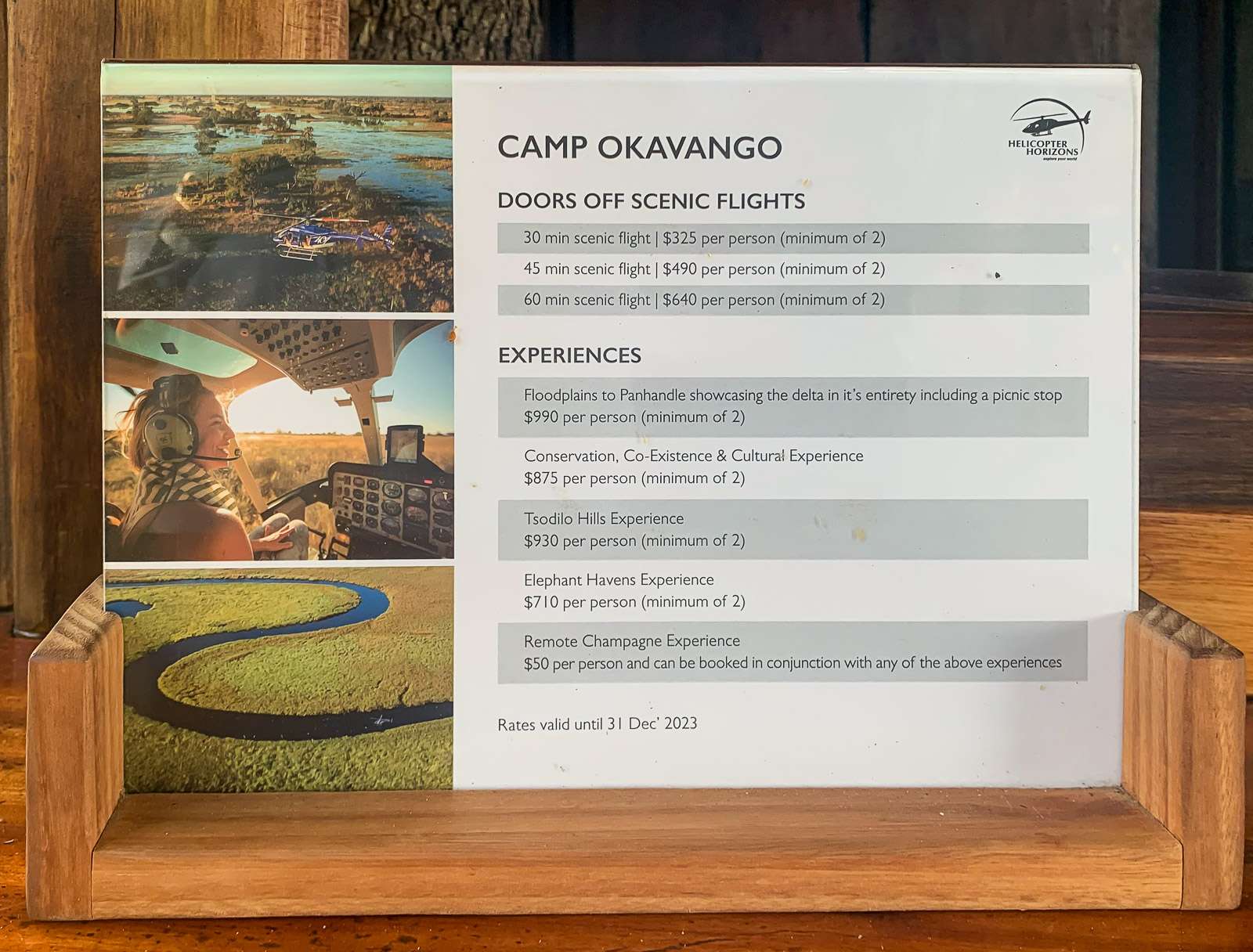 Camp Xakanaxa-jutussa avasin jo hiukan Okavangon suiston hintatasoa. Vuorokausihinta Camp Okavangossa oli marraskuussa (mid-season) aavistuksen kalliimpi, 1 650 euroa per vuorokausi (kahdelta). Leirit eivät muuten heinä-lokakuuta (high-season) lukuunottamatta veloita yksittäisiltä matkustajilta mitään lisiä, eli yhdeltä samaisesta huoneesta olisi veloitettu 825 euroa. Tasoltaan meistä Camp Okavango oli vielä upeampi kuin Camp Xakanaxa, mikä ehkä selittää pienen hintaeron.