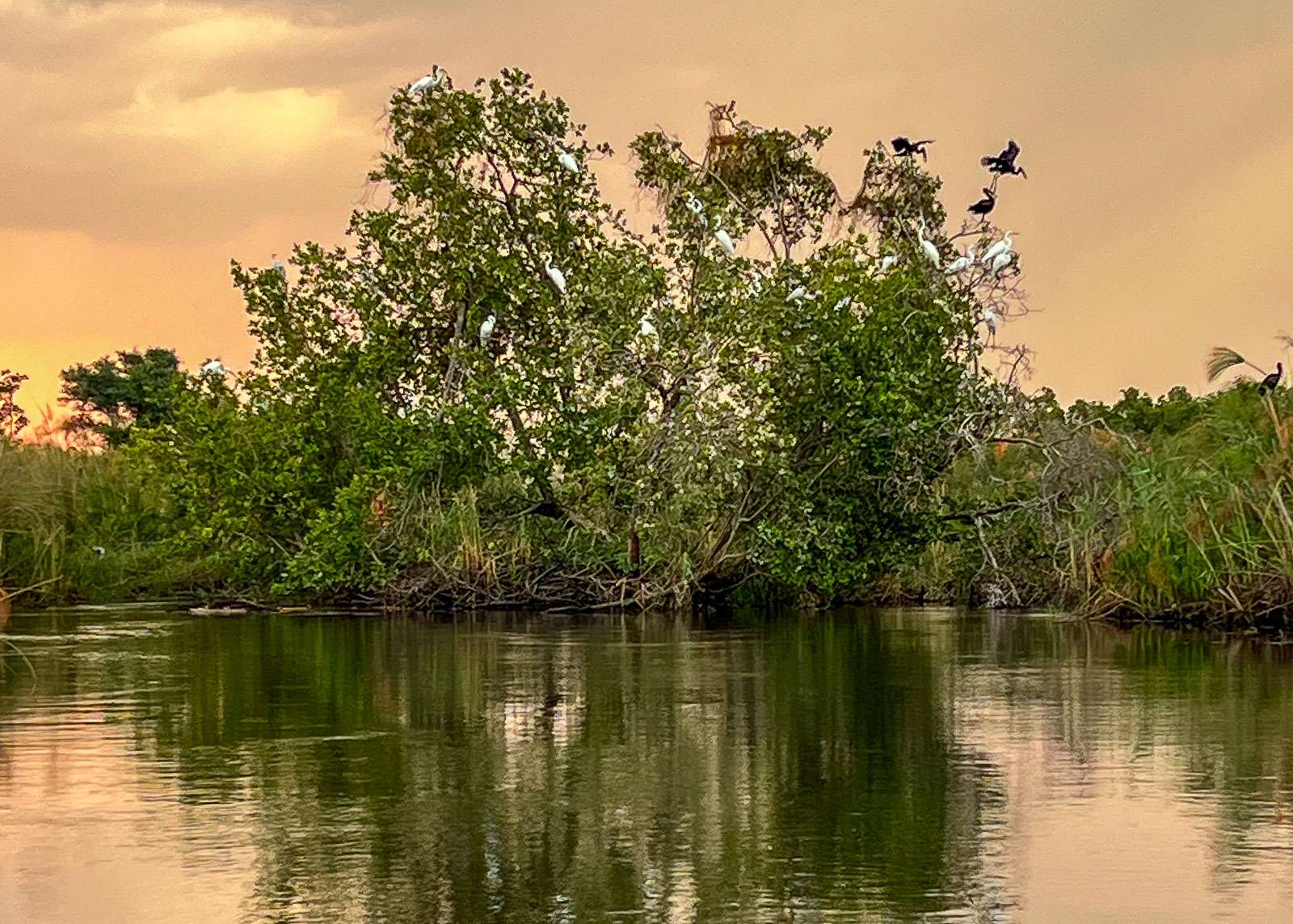 Krokotiilit paistattelivat päivää joen törmällä, norsut liikkuivat sujuvasti pienten kelluvien (?) saarten välillä uimalla ja virtahepoja näimme enemmän yhtenä laumana kuin koskaan. Norsut riuhtoivat kärsällään valtavan isoja ruohotuppoja suuhunsa, heittivät ehkä välillä mutaa selkäänsä – aurinkorasvahan on aina paikallaan näissä oloissa – ja niiden kanssa symbioosissa oleskelevat linnut huolehtivat liiallisista hyönteisistä.