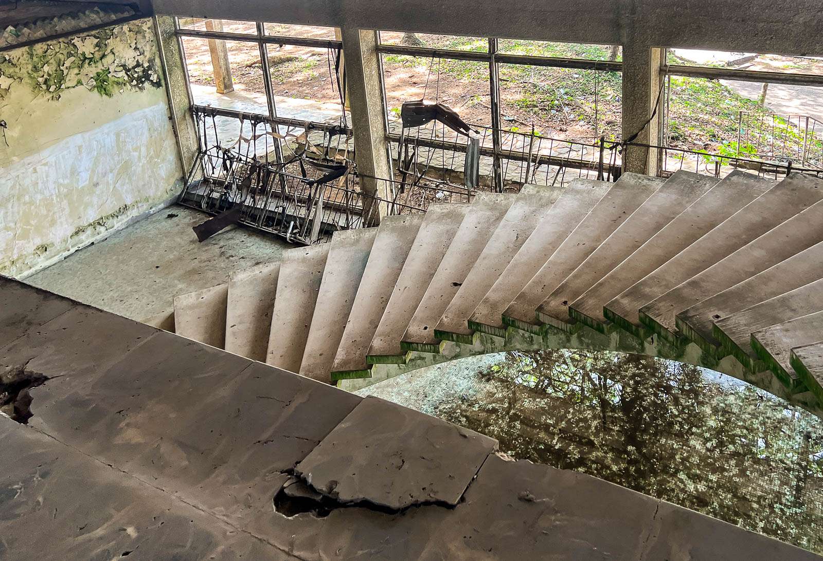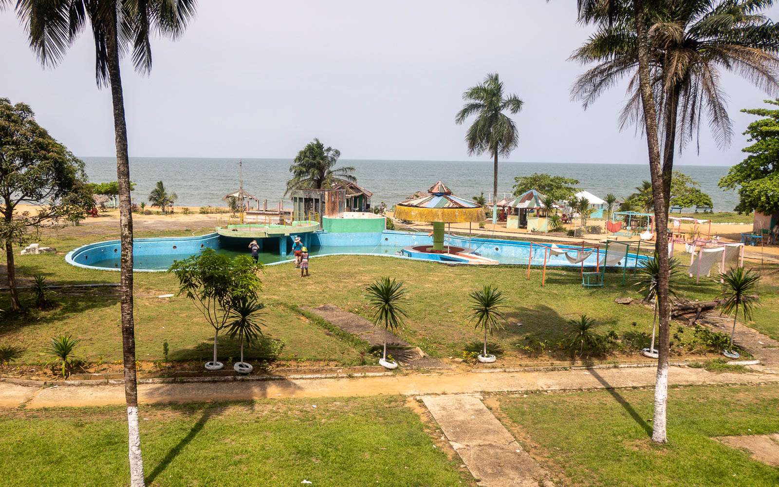 Hotel Africa oli vajaan tunnin matkan päässä Mamba Pointista – kilometreinä matkaa oli ehkä luokkaa 15 kilometriä suuntaansa. Teiden kunto on kuitenkin huono, joten ajonopeudet ovat pieniä, vaikkei ruuhkaa juuri olisikaan. Perillä meitä odotti toinen luurangoksi muuttunut hotelli kauniilla rannalla. Ducor-hotellissa kieltäydyimme kiipeämästä kahdeksanteen kerrokseen vaikka meille luvattiin hienot näköalat kaupungin ylle. Täällä annoimme lopulta periksi ja kiipesimme sentään toiseen kerrokseen. Halusimme nähdä Afrikan muotoisen uima-altaan, myös sen muodon. Toinen kerros kuitenkin riitti, sillä kaiteita ei portaissa luonnollisesti enää ollut, parvekkeiden reunat olivat mitä olivat ja jo pelkkä kävelykin hotellin sisällä vaati hienoista tarkkuutta, sillä lattialla oli isoja reikiä entisten kylpyhuoneiden kohdalla, viemäröinnistä tai putkista ei toki enää ollut tietoakaan.