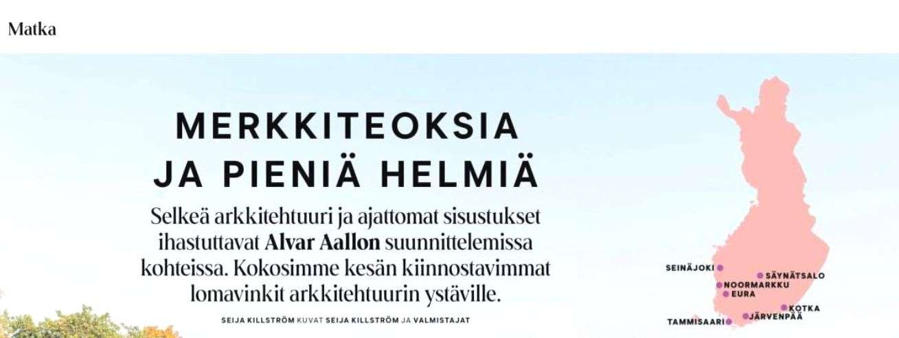 Aalto-kohteita toki on vielä paljon enemmänkin, mutta läheskään kaikki niistä eivät ole auki yleisölle – emmekä nyt näidenkään osalta, sen enempää kuin kansallispuistojen tai itsenäisten maidenkaan osalta tavoittele koko sarjaa, joka Aallon valtaisaa tuotantoa ajatellen olisikin mahdotonta.