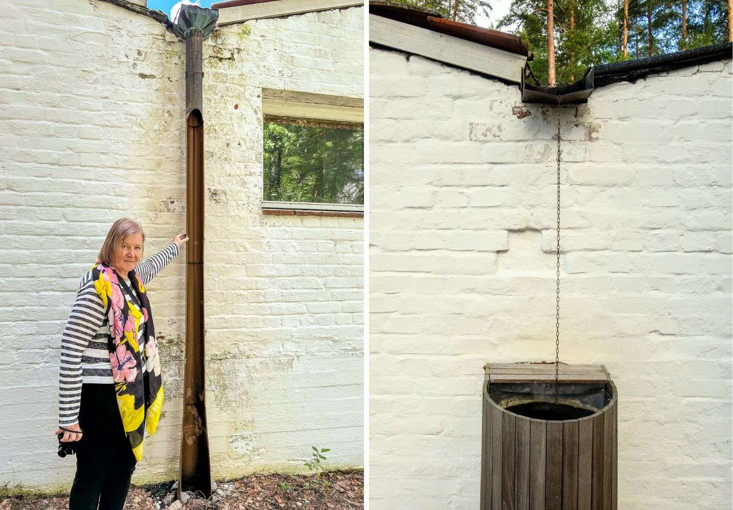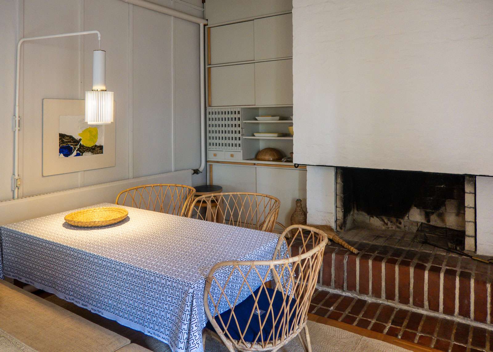Saunalta kierrämme lopulta koetalon patiolle, jonka seinät on rakennettu yli kymmenestä erilaisesta tiililaadusta. Oppaamme taisi mainita, että talolle kerättiin lähes kaikki tuolloin saatavilla olleet erilaiset tiililaadut. Pation keskellä on nuotiopaikka ja sen kulmassa kasvaa vehreä piippuköynnös. Luonto on toki lähellä myös huvilaa ympäröivän metsän muodossa. Pääsemme myös tutustumaan huvilan sisätiloihin ja toisin kuin Villa Maireassa tai Villa Skeppetissä täällä saa ottaa kuviakin. Näin siitä huolimatta, että huvila on edelleen ajoittain Aallon suvun käytössä.