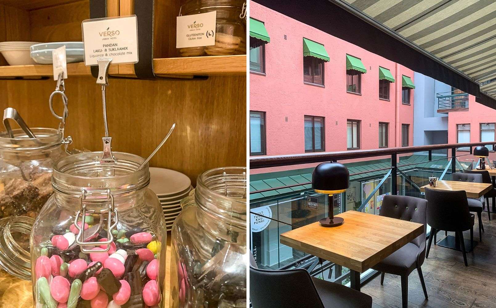 Verson superior-huone sisäpihanäkymällä ei nyt varsinaisesti säväyttänyt, paitsi ehkä kylpyhuoneensa osalta. Hotellin aamiaisen erikoisuus on niin tiukka panostus lähiruokaan, että appelsiinimehun sijaan tarjolla on omena- ja mustikkamehua, mutta toisaalta sitten myös Pandan lakritsia!