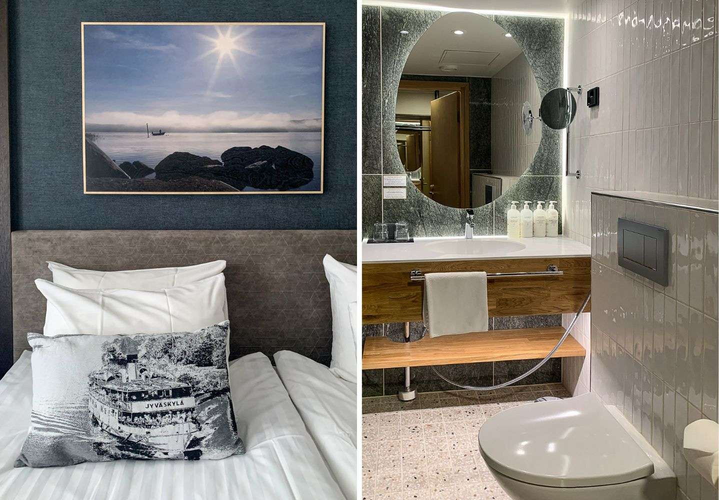 Säynätsalon kunnantalolta jatkoimme yöksi Jyväskylään, jonne on matkaa alle 20 kilometriä. Tällä kertaa majoituimme hotelli Versoon ihan keskustan kävelykadun varrella. Joitakin vuosia sitten yövyimme Jyväskylässä hotelli Yöpuussa, joka on samaisen perheyrityksen toinen hotelli kaupungissa. Autolla liikkuessa Yöpuu ehkä sittenkin vie voiton, mutta kyllä me Versossakin selvisimme hengissä kunhan olimme lopulta suoriutuneet pysäköintikuvioista.