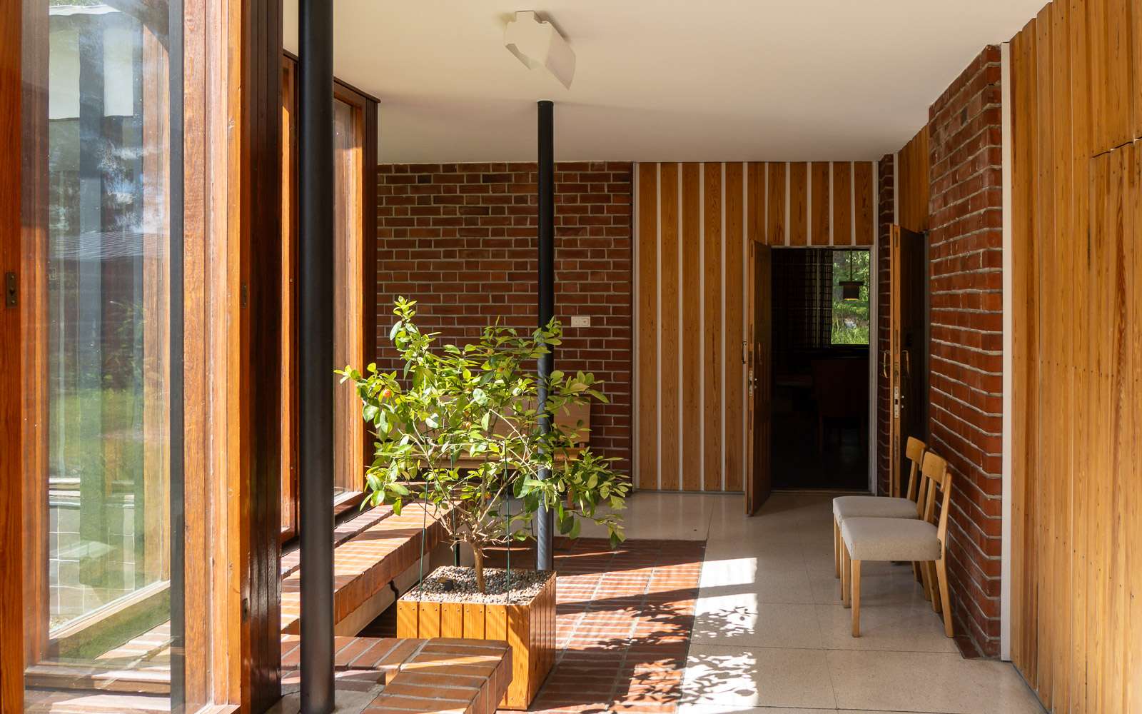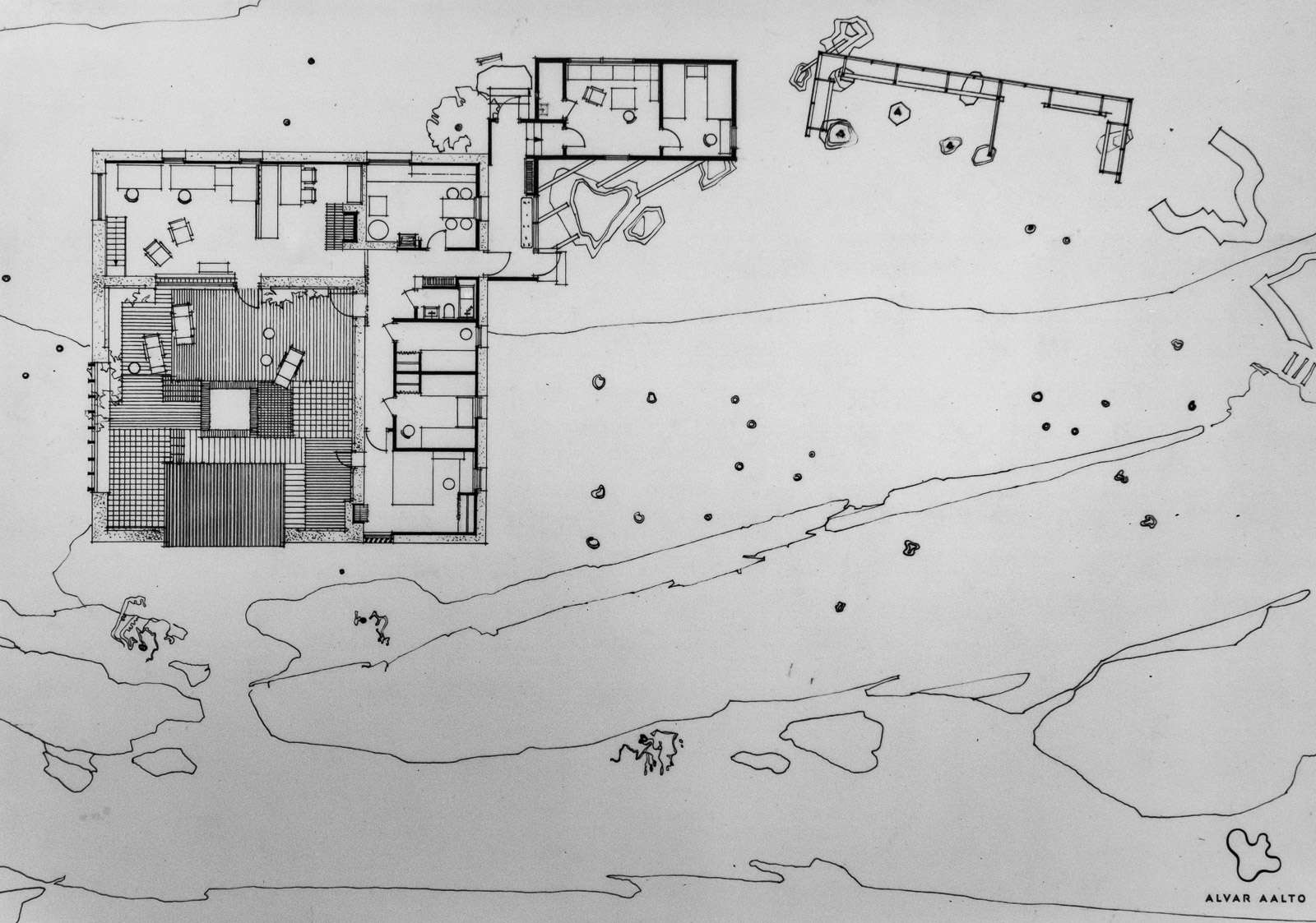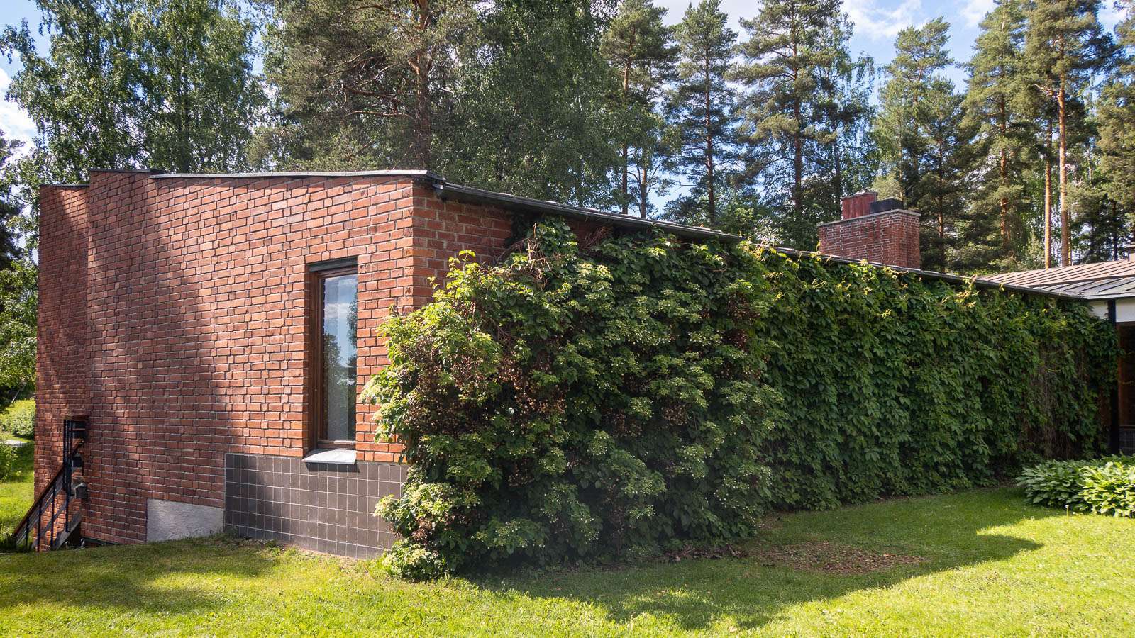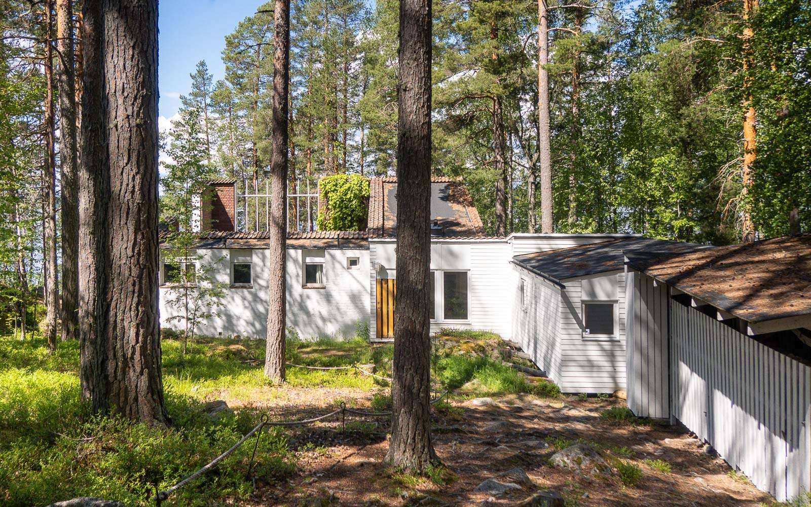 Huvilassa tehtiin myös kesäisin töitä, nykyisin niitä kutsuttaisiin etätöiksi, ja sen myötä olohuonetta hallitsevatkin työpöydät. Makuuhuoneet sijoittuvat omaan siipeensä. Kuten lähes aina Aallon tuotannossa rakennus on sijoitettu osaksi ympäröivää luontoa ja sellaisena se sulautuukin hyvin ympäröivään metsämaastoon. Patio muodostaa luontevan suojaisan kohtaamispaikan asukkaille ja tarjoaa jatkumon myös sisätiloille, jotka – kuten kesäasunnoissa usein – eivät ole koolla pilattuja.