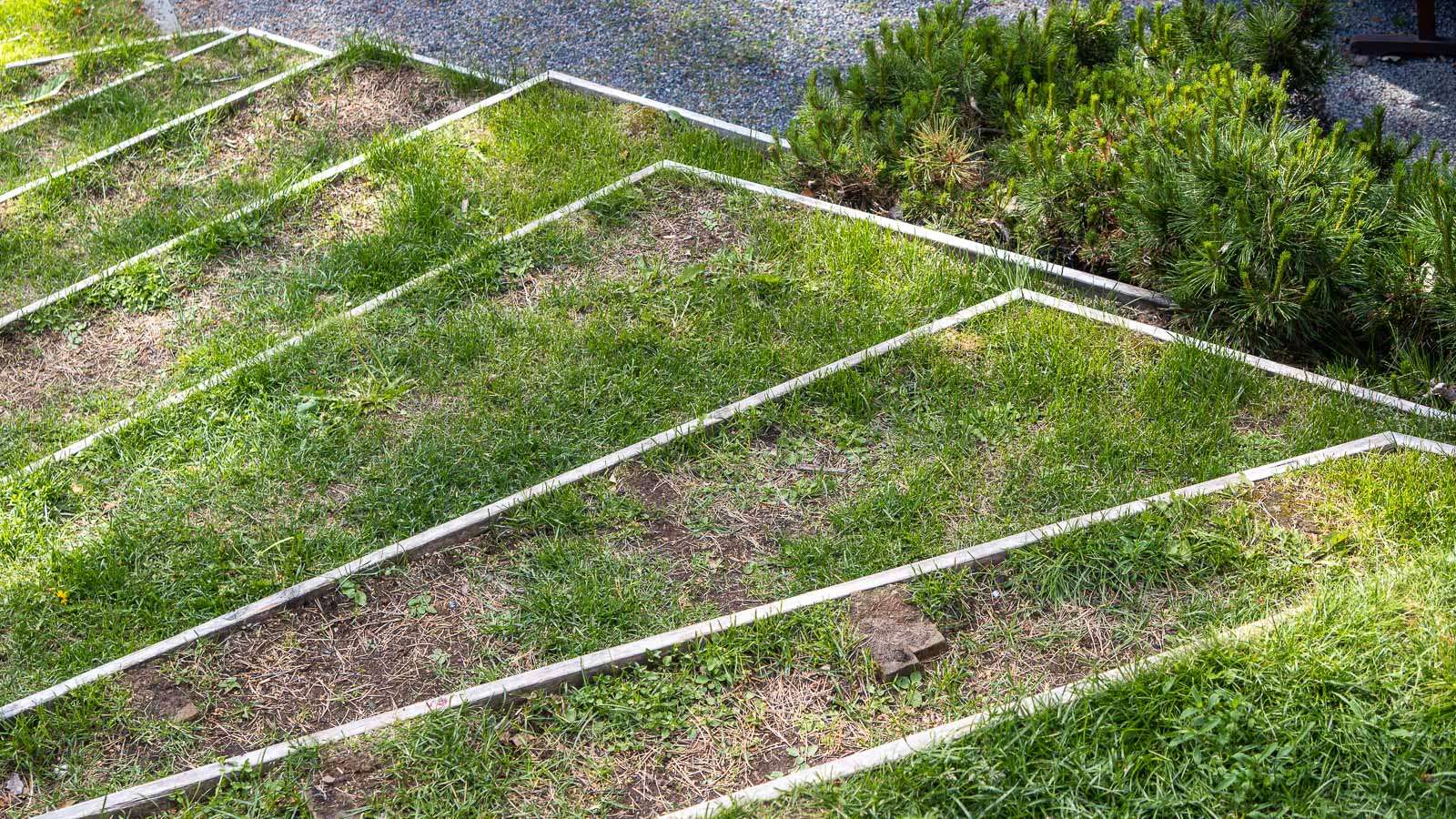 Tutustumiskäynnin kokoontumispaikka on tien ja tontin laidassa, niin kaukana rannasta ja huvilasta, ettei talosta alkuun näe vilaustakaan. Jos joku miettii, että onko kohde esteetön, niin koetalo ei todellakaan ole sitä – metsäpolku rantaan on ainakin pari sataa metriä pitkä ja todellakin vain polku. Lopulta näkyviin tulee kuitenkin huvilarakennuksen valkoinen takaseinä ja sen yhteydessä olevat puiset lisärakennukset. Lisärakennusten osalta koerakentamista edustavat puiset pölkyt joiden varassa vierasmaja on ja suoraan maalle rakennettu vaja. Perustuksena toimivia pölkkyjä joudutaan kuulemma ajoittain uusimaan. Myös puolentoista metrin korkeudelta alkaen “aukileikattu” ränni edustaa kokeiluja.