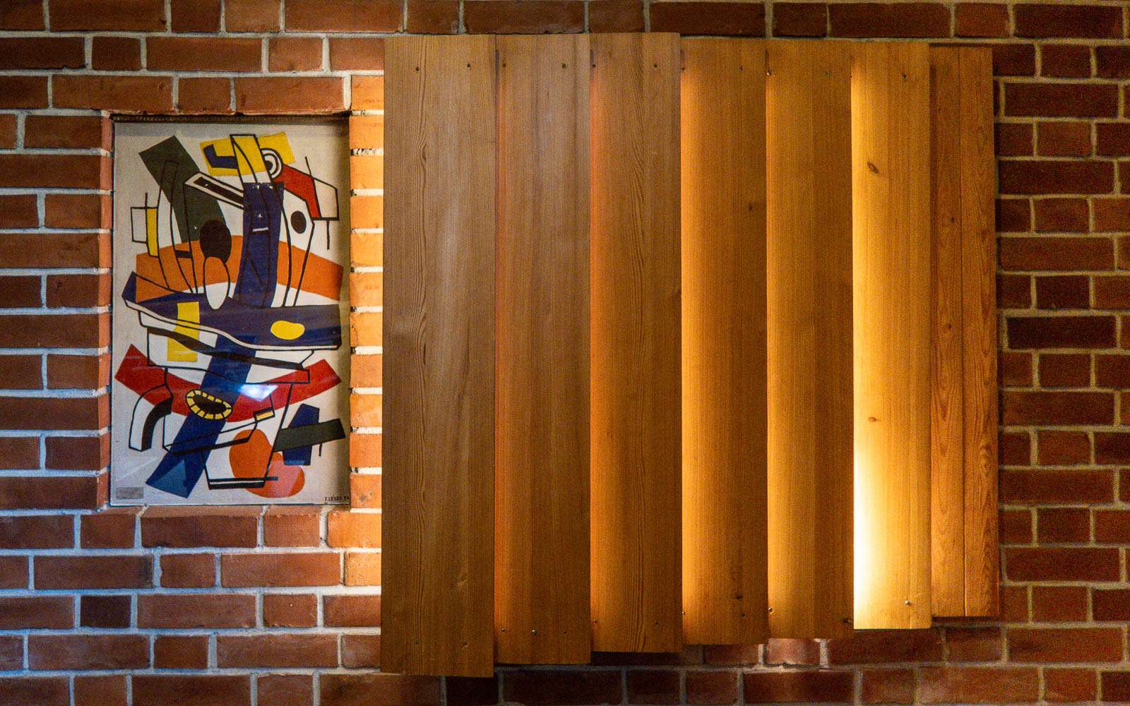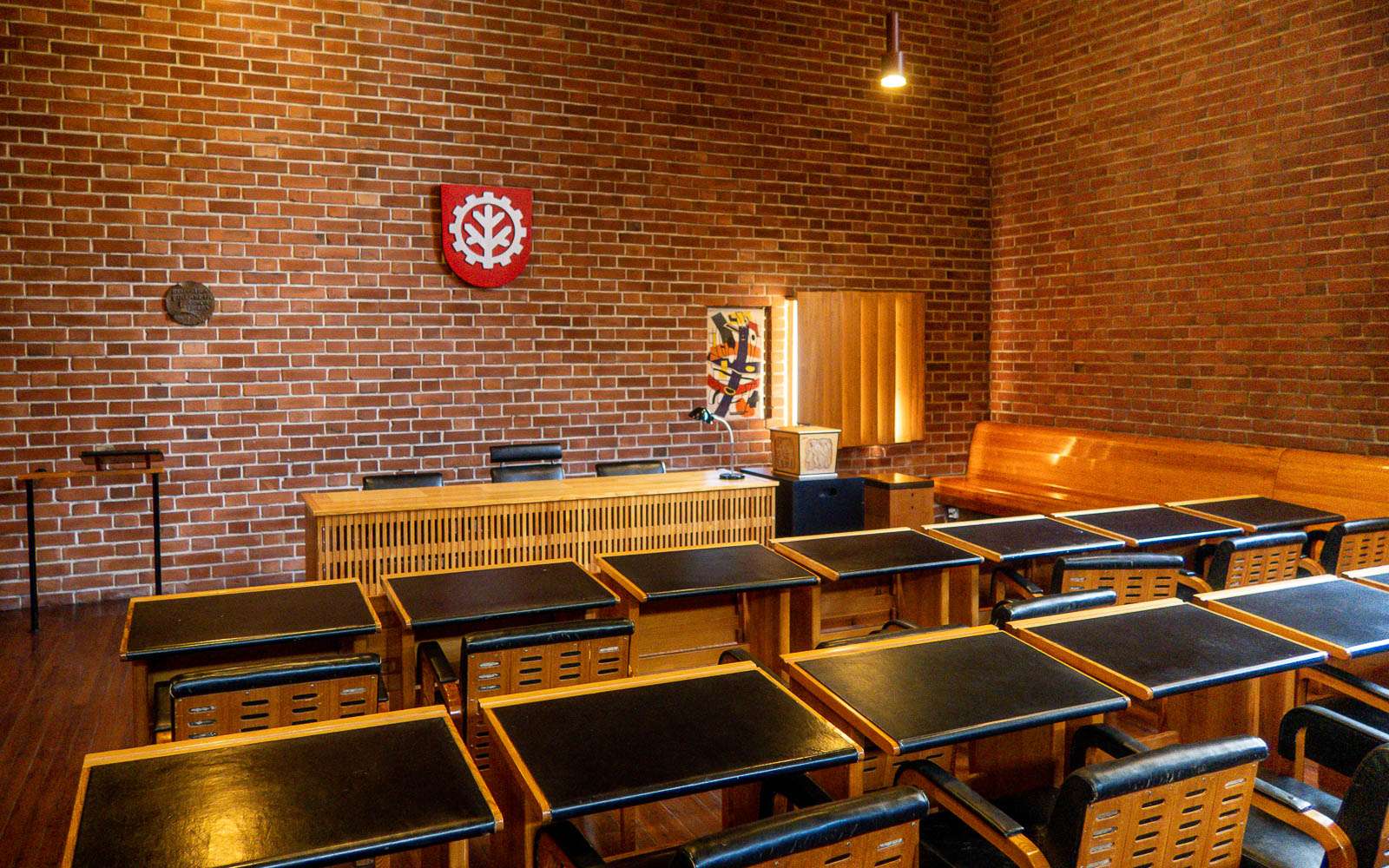 Opastetun kierroksen myötä pääsimme myös tutustumaan entiseen valtuustosaliin rakennuksen toisessa, tai katutasosta laskien kolmannessa kerroksessa. Punaisten tiiliseinien lisäksi valtuustosalin valaistus oli luonnollisuudessaan vaikuttava. Myös tarina Alvar Aallon ranskalaisen ystävän Fernand Legerin juuri Säynätsalon kunnantalolle tiettyyn kohtaan toteuttama abstrakti maalaus oli mielenkiintoinen. Fernand Leger oli jo tuolloin kuuluisa, mutta Säynätsalon kunnan päättäjät eivät oikein arvostaneet abstraktia taidetta, jolloin Alvar Aalto lunasti työn itselleen varsin kohtuullisella 3000 dollarin hinnalla. Myöhemmin työ myytiin huutokaupassa miljoonilla. Säynätsalon kunnantalolla taulun alkuperäisellä paikalla on nykyisin sen kopio. Toisaalta, jos kunnantalolla olisi esillä miljoonien arvoinen työ, niin talon vartiointiin pitäisi varmasti panostaa aivan erityisesti. Vähän kuin Strömforsin kirkossa, jossa on Helene Schjerfbeckin maalaama alttaritaulu.