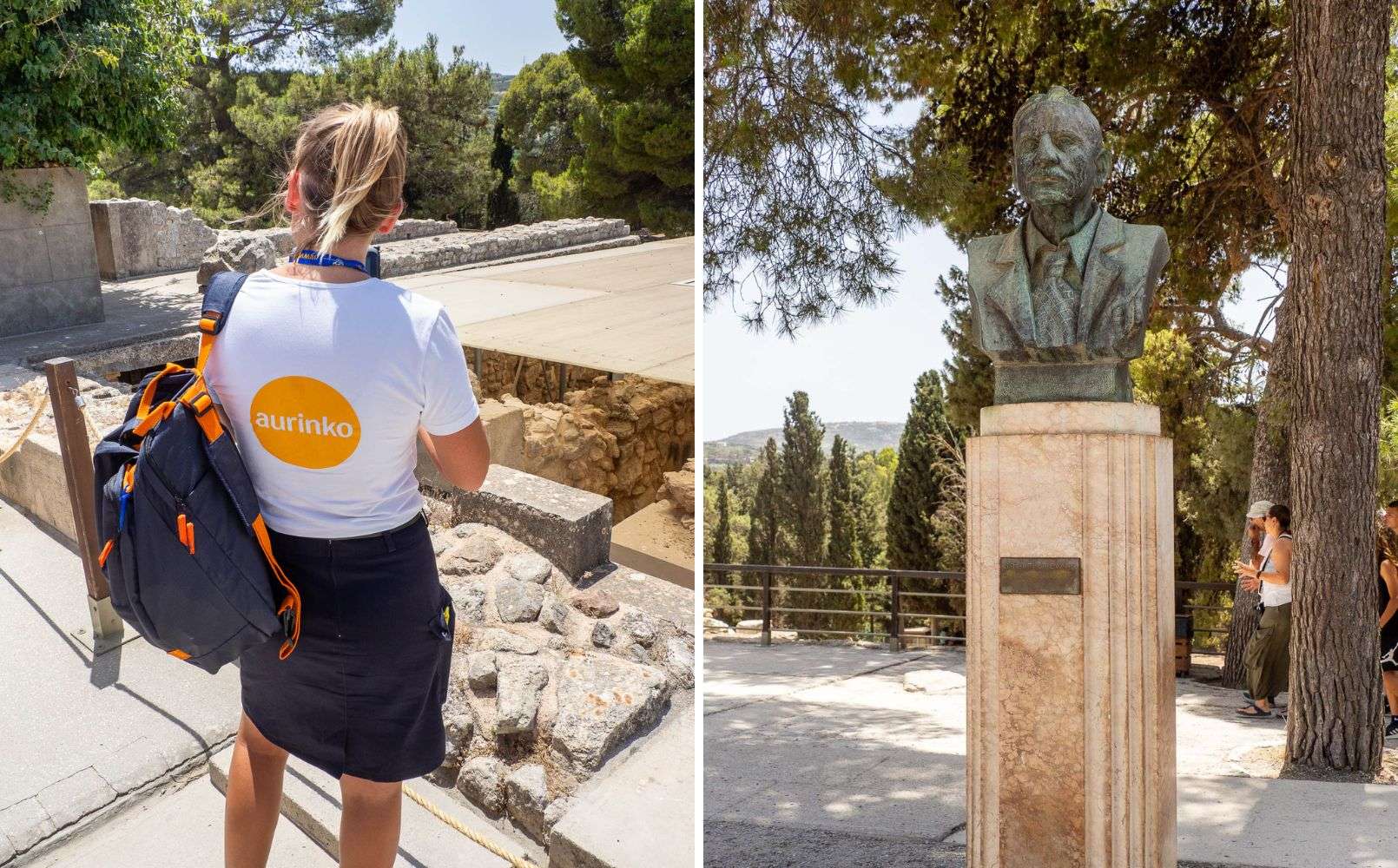 Monet sanovat, että Knossoksen palatsialueelle kannattaa hakeutua aikaisin aamusta, mutta me saavuimme sinne vasta iltapäivällä. Aurinkomatkojen oppaiden kokemuksen mukaan tuo laajalti tunnettu ohje aikaisesta aamusta on johtanut siihen, että alue on aamupäivisin todella ruuhkainen ja iltapäivällä paljon väljempi. Aamupäivällä saattaa toki olla hiukan viileämpää. Alueella ei muuten ole vesipisteitä tai kioskeja, eli vettä kannattaa olla matkassa reilusti. Kierros päätttyy, luonnollisesti, ravintola- ja matkamuistokujalle, ja onnistunutta kierrosta voikin sitten heti juhlistaa vaikka raikkaalla smoothiella!