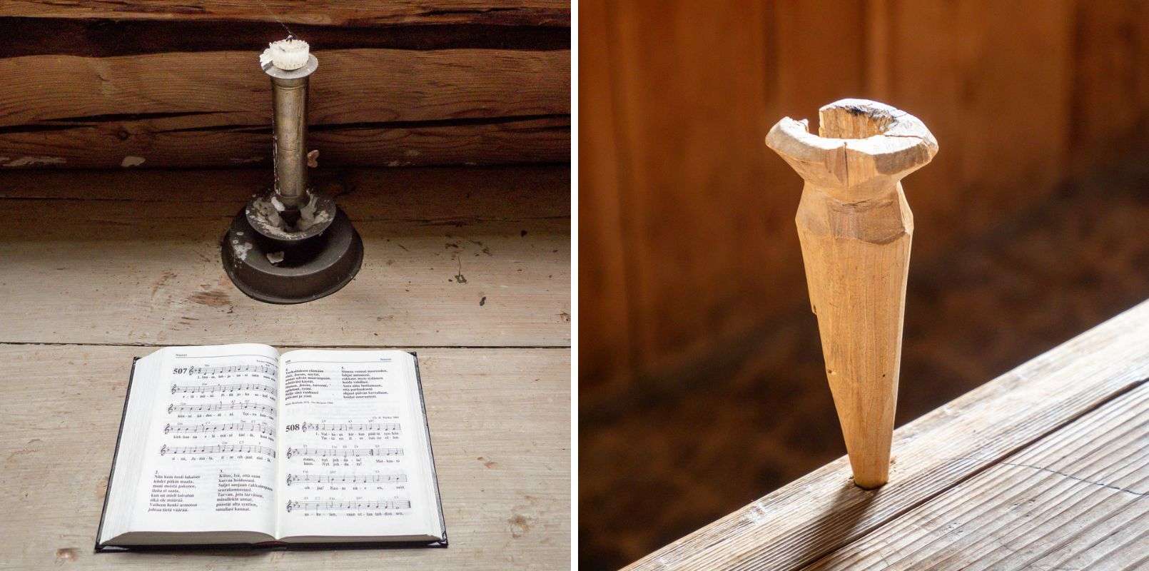 Kirkon valaistus on ollut kynttilöiden varassa – oikealla kynttiläteline penkin reunassa