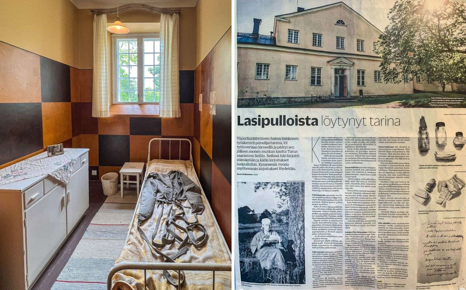 Vanha potilashuone, jonka ruudullisia seiniä selittää ajatus siitä, että mieleltään sekaisin olevan ihmisen tilannetta parantaa “järjestyksessä” oleva ympäristö. Lehtileike kertoo saarelta löytyneistä potilaan kirjeistä, joista on kirjoitettu kirja Pullopostia Seilin saarelta.