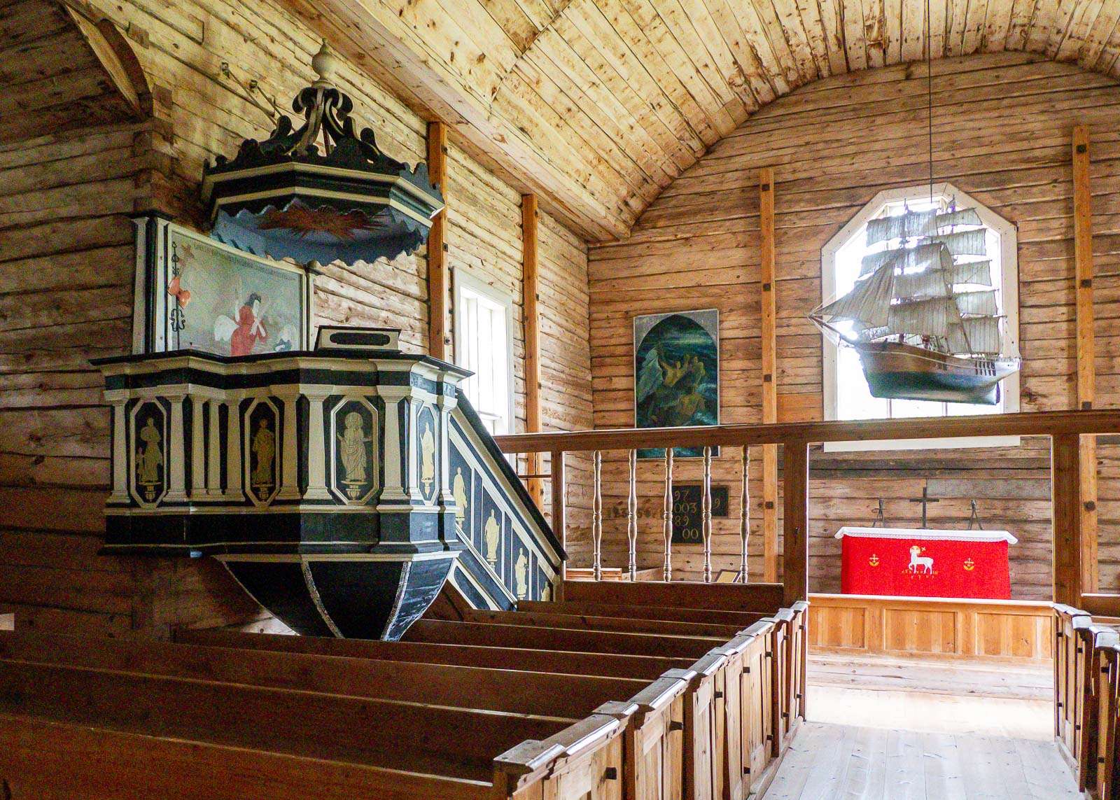 Punainen alttarivaate on kuulemma Sylvi Salosen lahjoittama saatesanoilla, että pitäähän kirkossa olla väriä